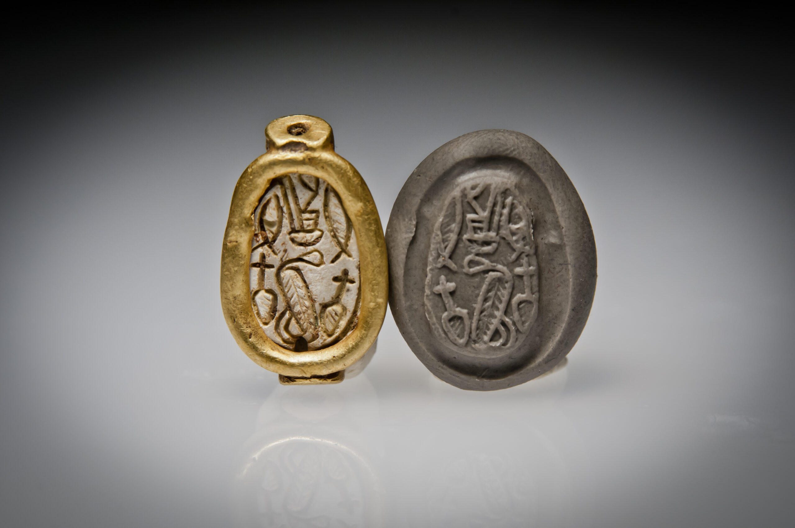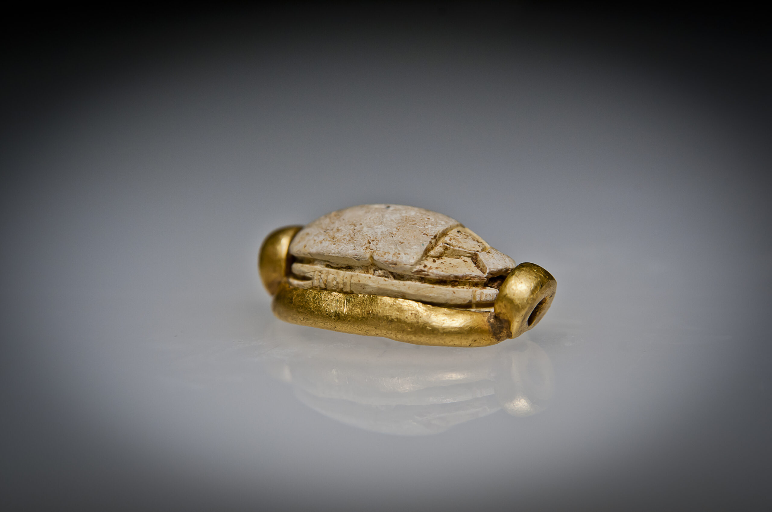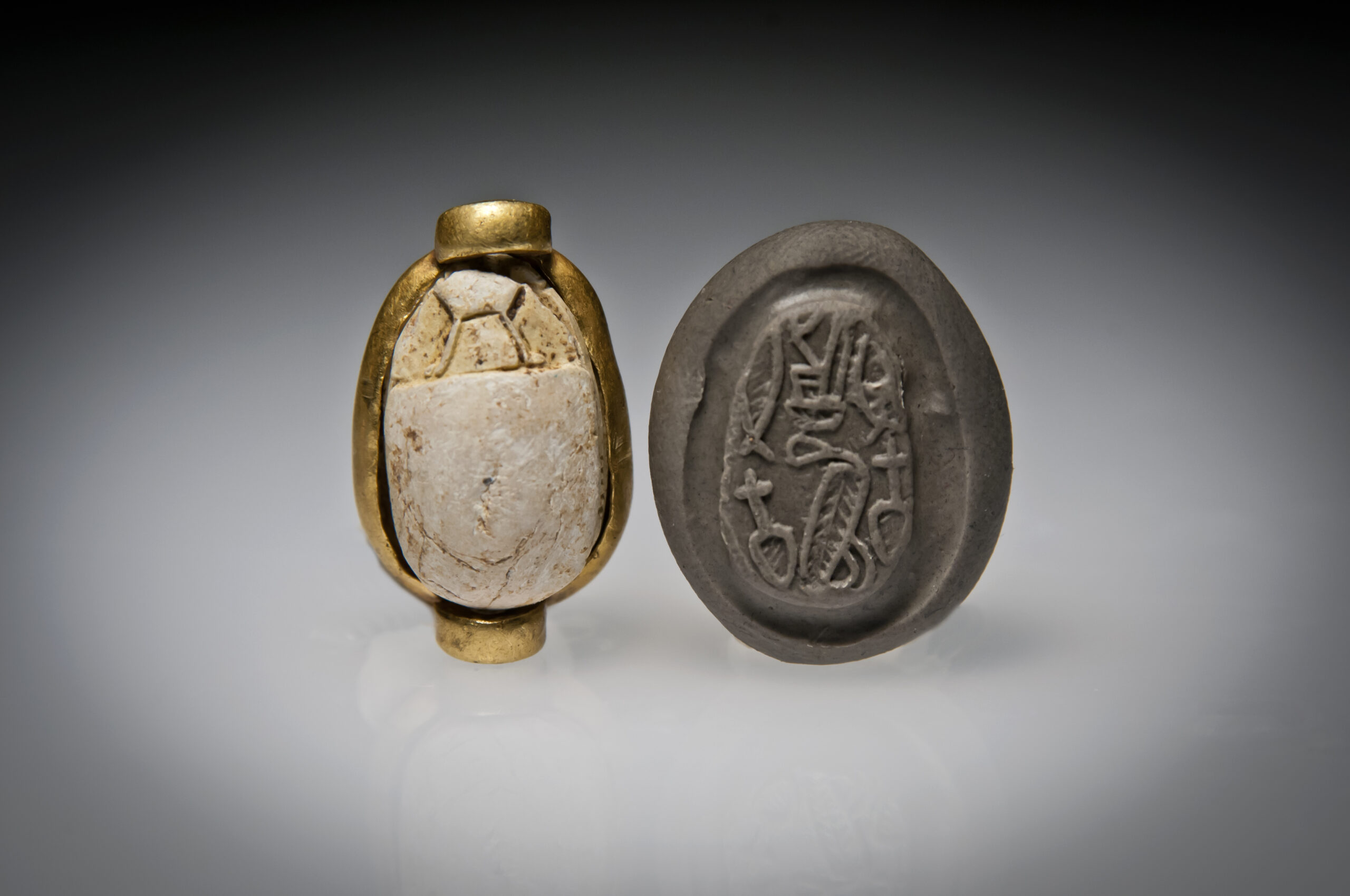 A Hyksos Steatite Scarab Engraved with a Cobra with a Red Crown and Hieroglyphs and a Gold Bezel