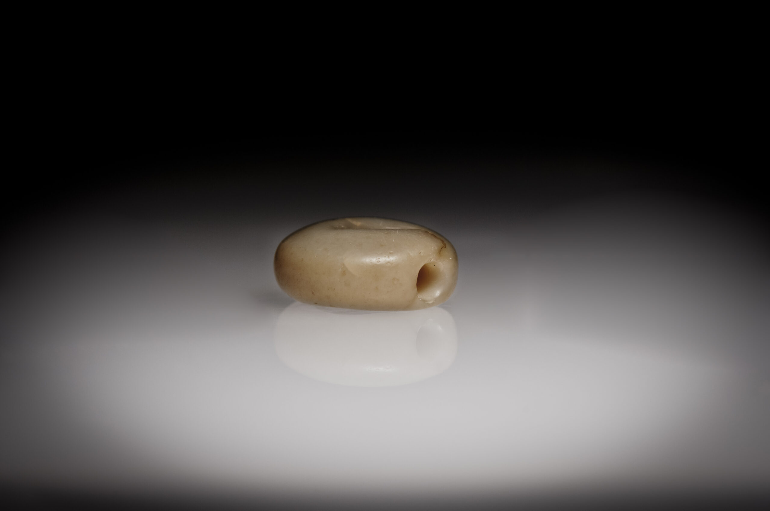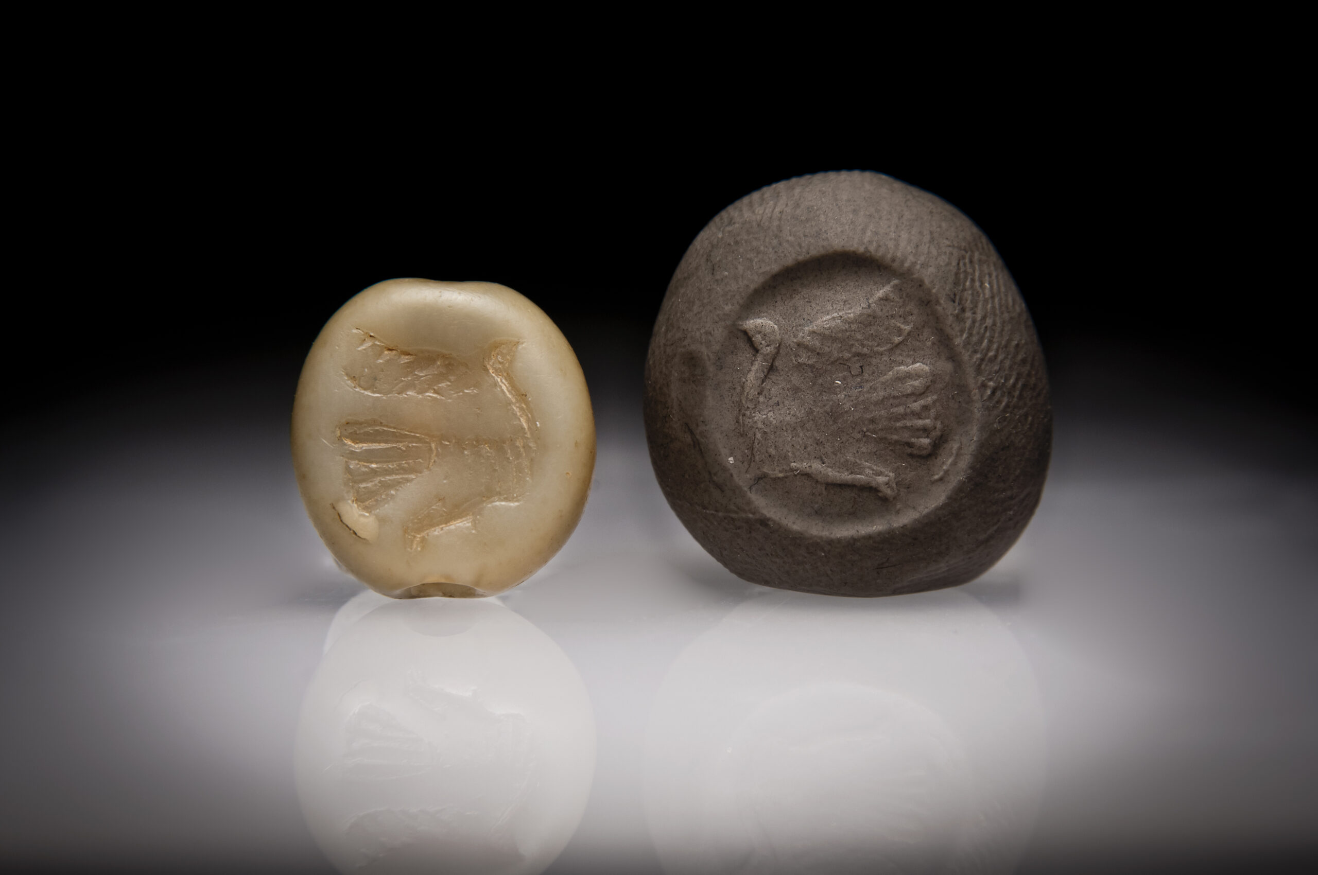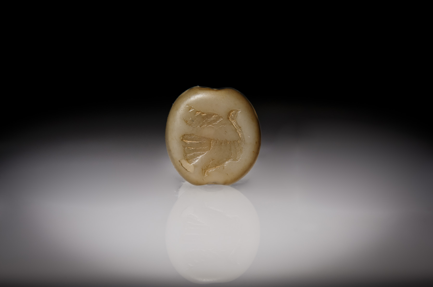 A Canaanite Steatite Scarab Seal Engraved with a Male Holding a Lotus
