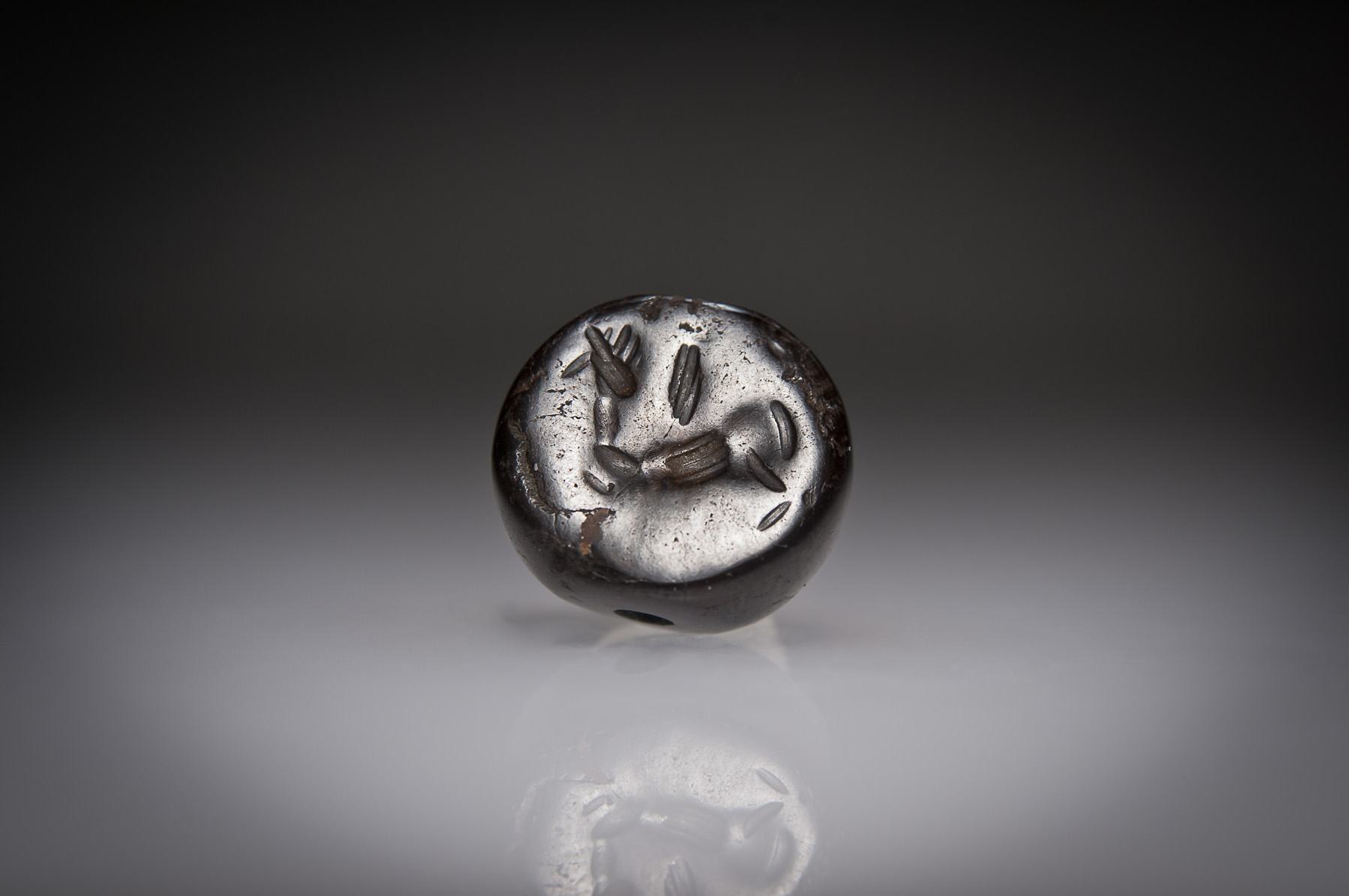 A Hyksos Steatite Scarab Engraved with a Sphinx with a Cobra above it, and a Palm Branch in Front