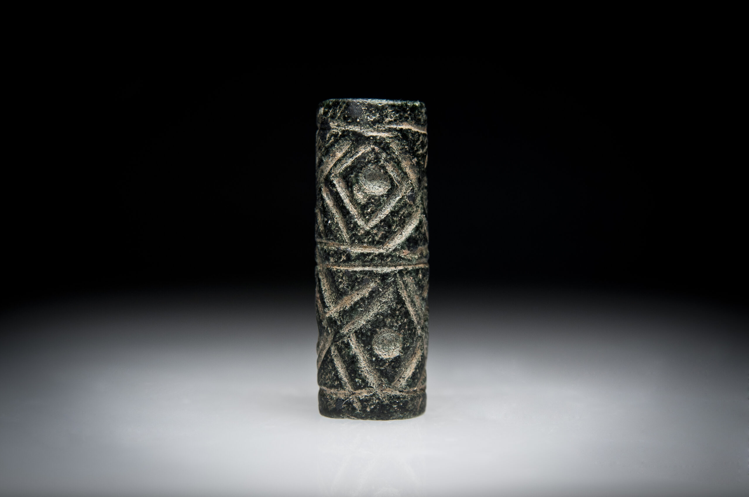 A Canaanite Steatite Scarab Seal Engraved with a Male Holding a Lotus
