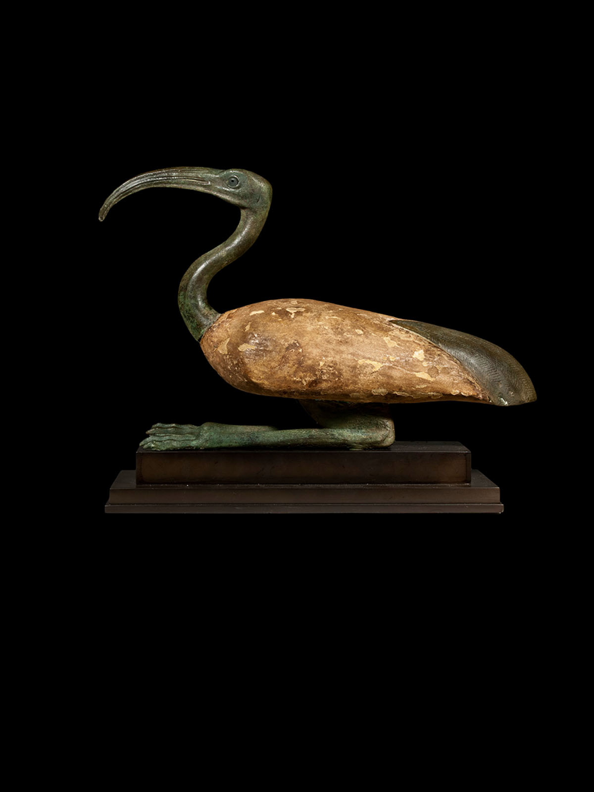 Our bronze ibis would probably have been dedicated at a temple to Thoth, Egyptian god of writing, magic and wisdom, whose sacred animal was the ibis, and who often appeared as a man with the head of an ibis. As the creator of mankind, Thoth was one of the most important gods in the Egyptian pantheon. His main sanctuary was located in Hermopolis, a city that was known for its wealth.