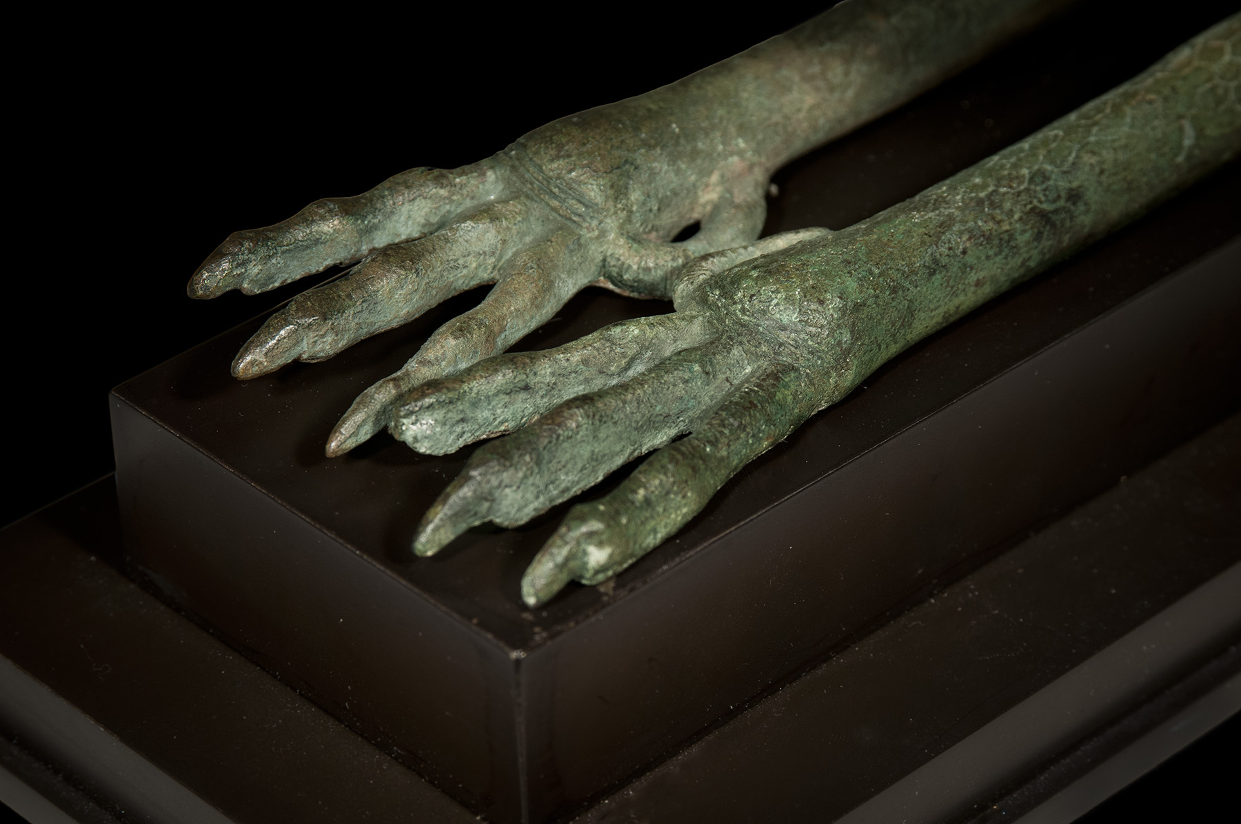 Great attention has been paid to the accurate and skillful rendering of the anatomic details of the ibis. Incised decoration replicates the structure of the bill, the eyes and the feathers and skin of the legs. The long, curved beak is harmoniously in proportion to the body, which has been simplified and streamlined to the point where it is an exercise in pure form. The bone structure of the beak and the head are represented through carefully nuanced modeling. The graceful contours of the neck flow into the body, of which only the outlines of wings, modeled on the underside as a slight ridge, are visible. The stylized mass of tail feathers was made separately and then inserted into the body.