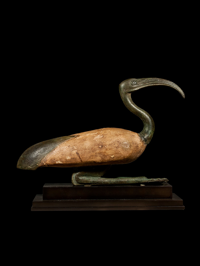 Our bronze ibis would probably have been dedicated at a temple to Thoth, Egyptian god of writing, magic and wisdom, whose sacred animal was the ibis, and who often appeared as a man with the head of an ibis. As the creator of mankind, Thoth was one of the most important gods in the Egyptian pantheon. His main sanctuary was located in Hermopolis, a city that was known for its wealth.
