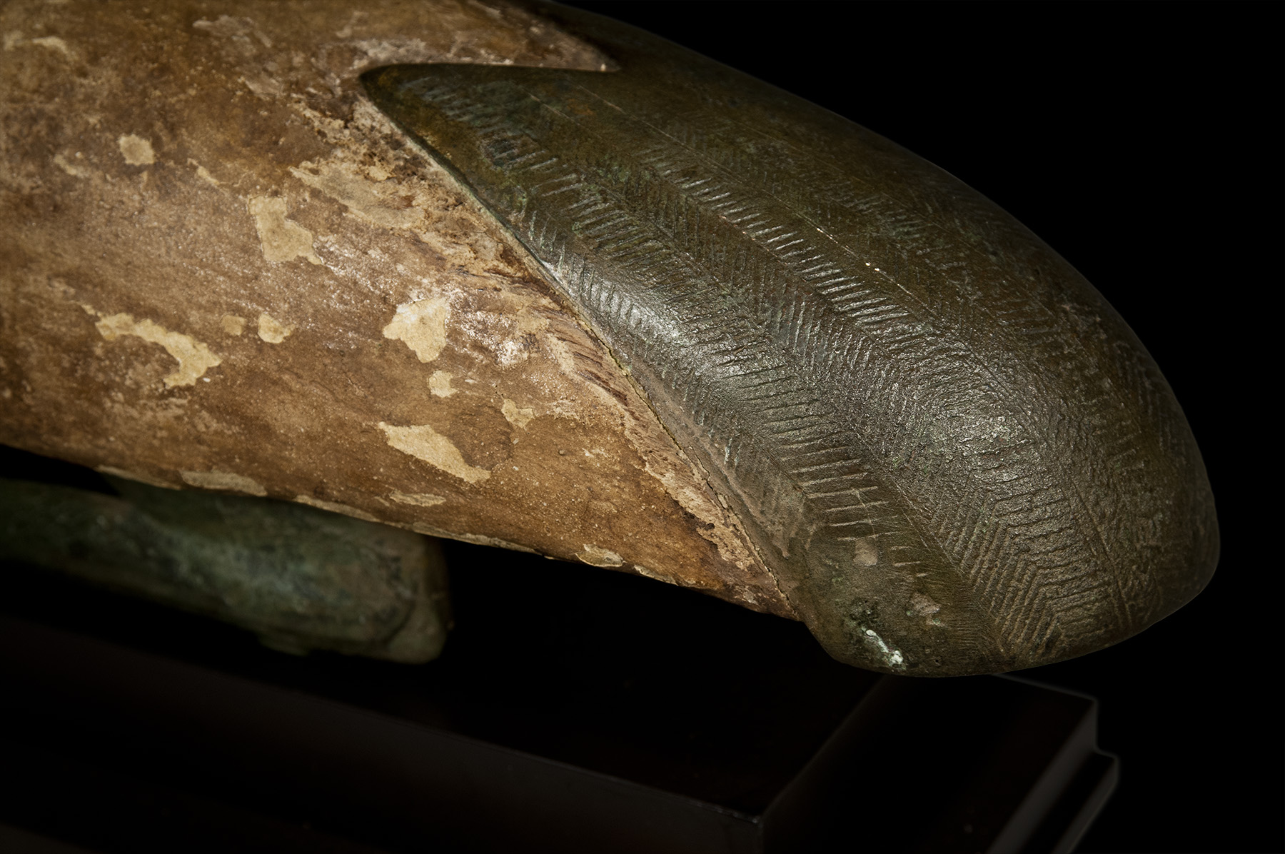 Great attention has been paid to the accurate and skillful rendering of the anatomic details of the ibis. Incised decoration replicates the structure of the bill, the eyes and the feathers and skin of the legs. The long, curved beak is harmoniously in proportion to the body, which has been simplified and streamlined to the point where it is an exercise in pure form. The bone structure of the beak and the head are represented through carefully nuanced modeling. The graceful contours of the neck flow into the body, of which only the outlines of wings, modeled on the underside as a slight ridge, are visible. The stylized mass of tail feathers was made separately and then inserted into the body.