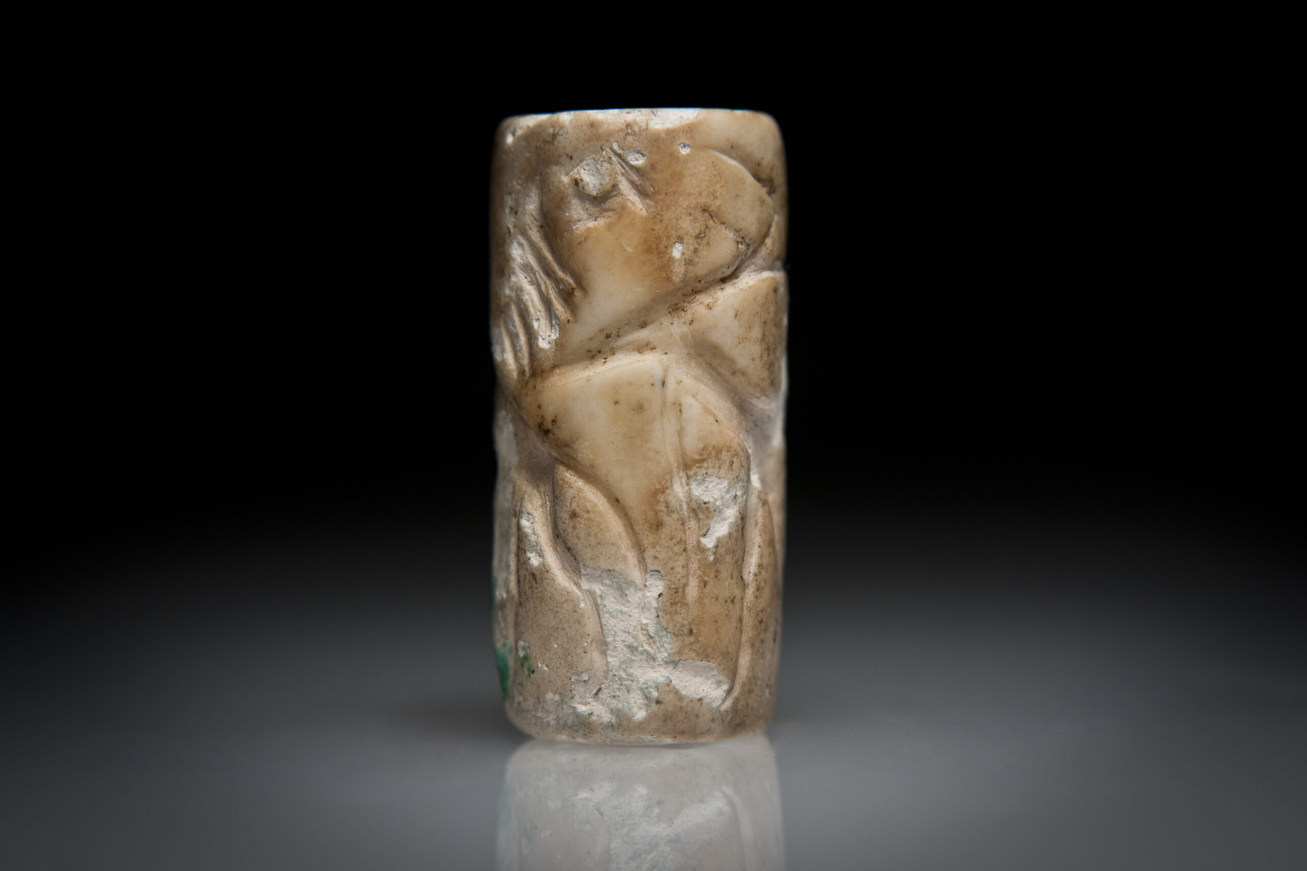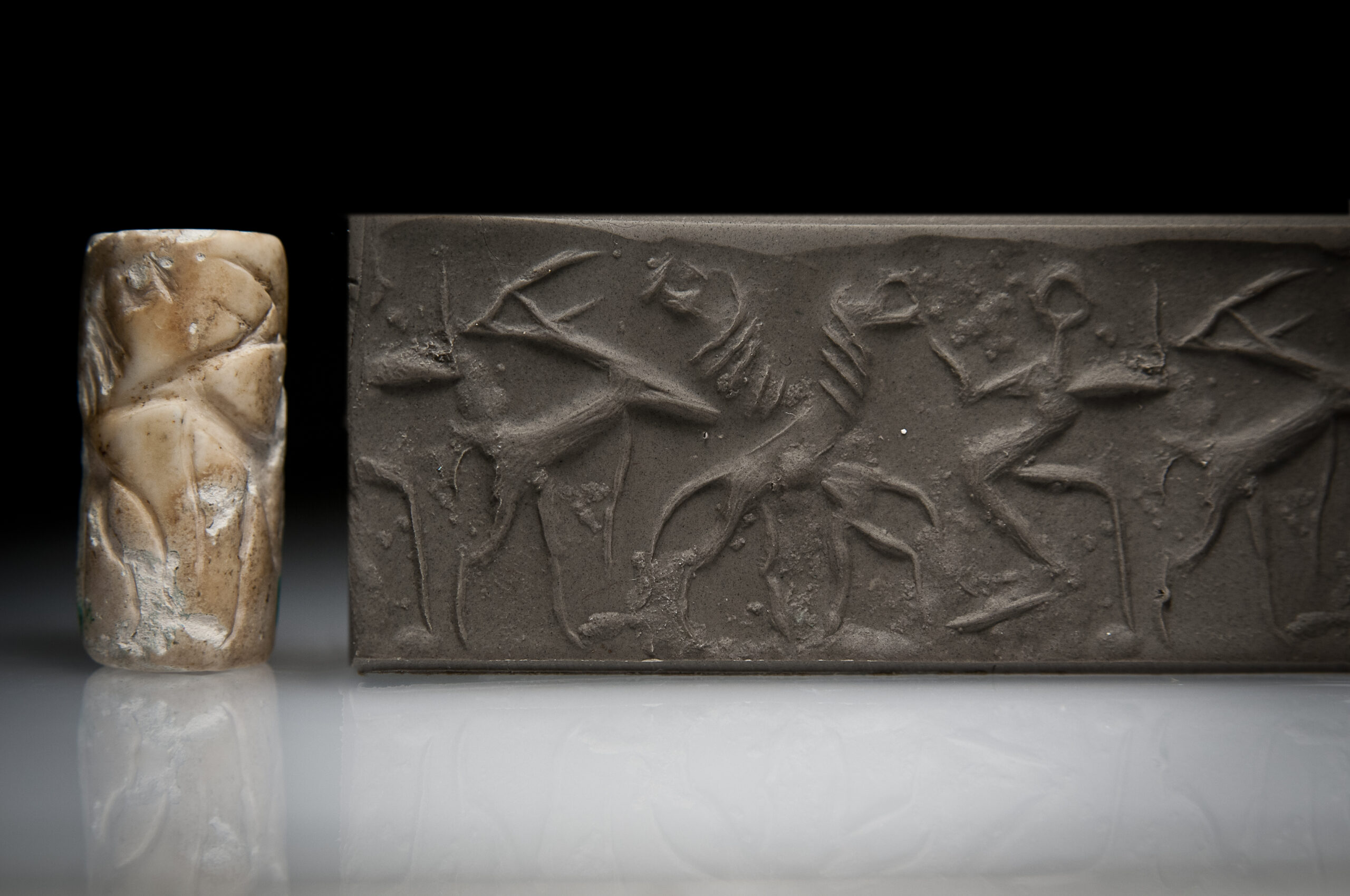 An Akkadian Plagioclase Cylinder Seal with Two Lions, and a Figure Feeding a Gazelle