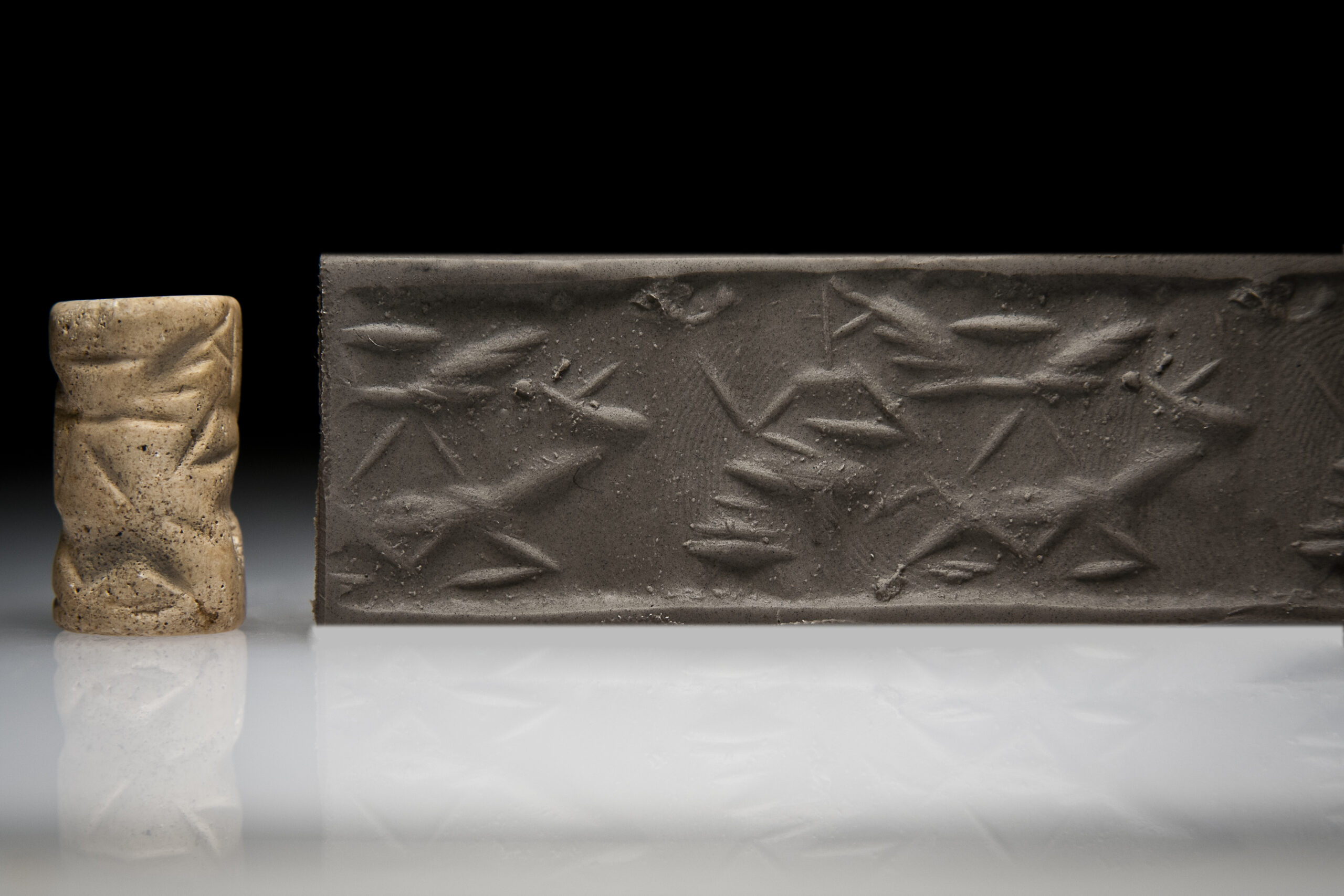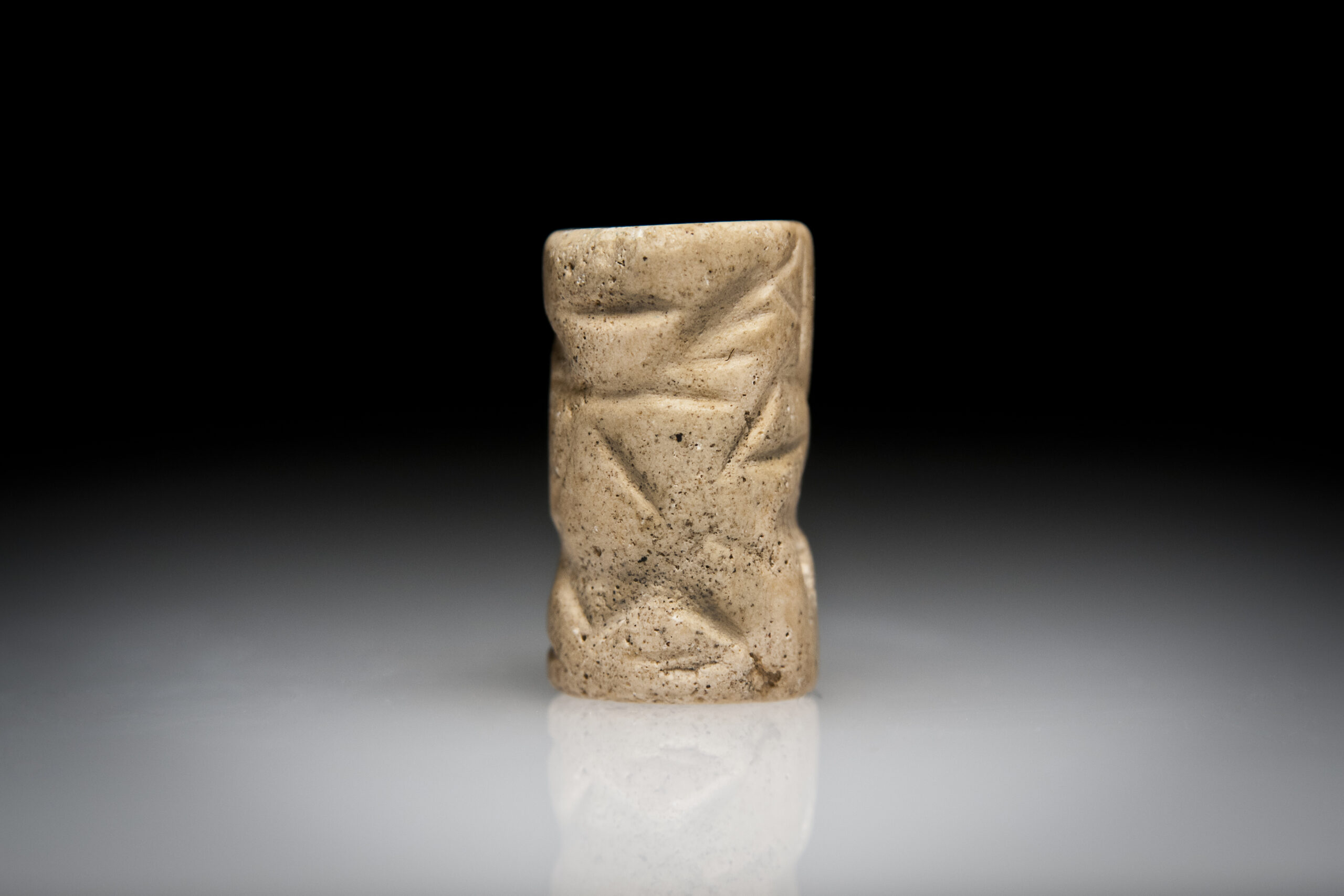 An Early-Dynastic Limestone Cylinder Seal with a Seated Figure, a Bird and an Animal