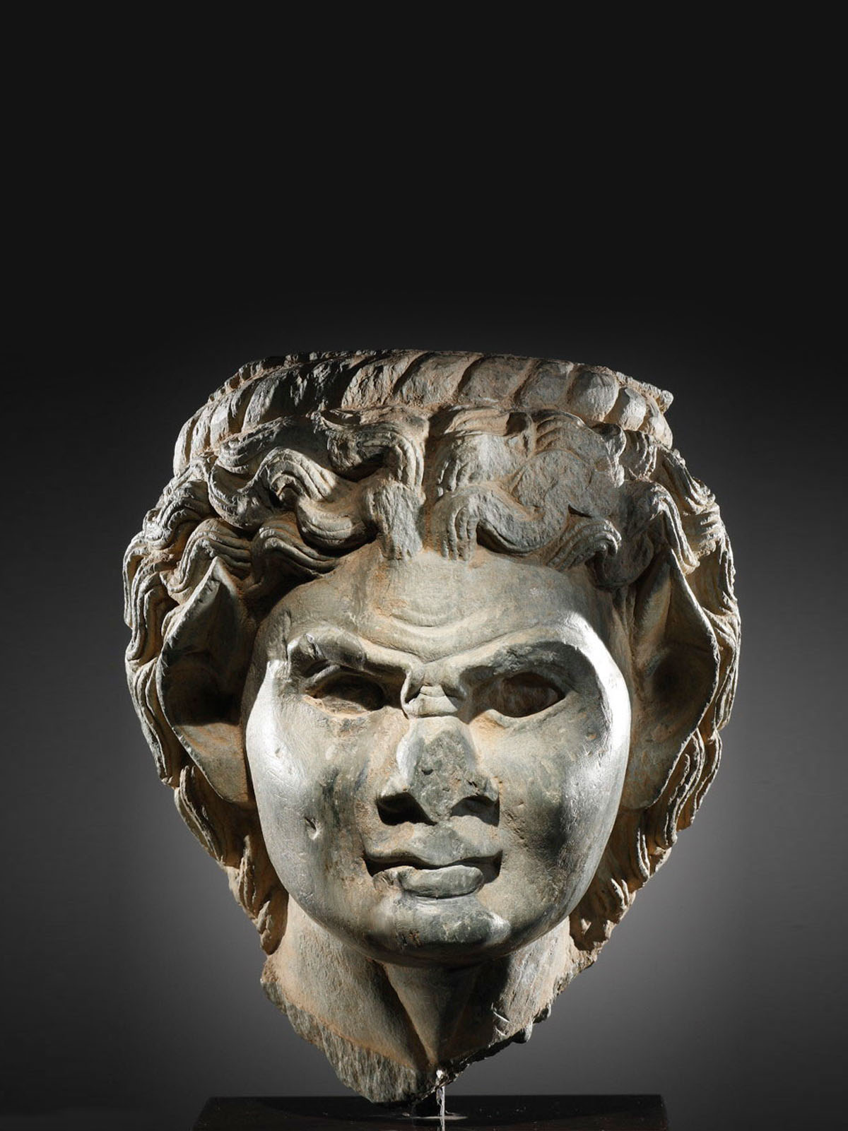 The expressive face of this satyr reveals a right eye that is slightly lower than the left and a smirk carved purposefully askew. The satyr himself may be of Greek origin, yet this piece hails from central Asia, a result of the clash of cultures that arose out of Alexander the Great’s successful campaigns throughout the region. The result was a vast melting pot of culture, art and religion that spanned the subsequent Hellenistic era of Greek history, when Greek cultural influence and power was at its zenith in Europe and Asia. At the time, this satyr’s inlaid eyes and simple braided crown were uncommon in Asian art, particularly seen in Buddhist sculptures of Siddhartha from the Gandhara region of northern Pakistan. Other examples include the famous Parthian relief from Hatra, as well as the hair and head of the Peshawar Museum’s Bodhisattva. In the years after Alexander’s conquests, the region’s sculpture incorporated such elements in the intervening years as trade and technology increased the mingling of Eastern and Western cultures, creating new currents of art and thought that still inspire us to this day.