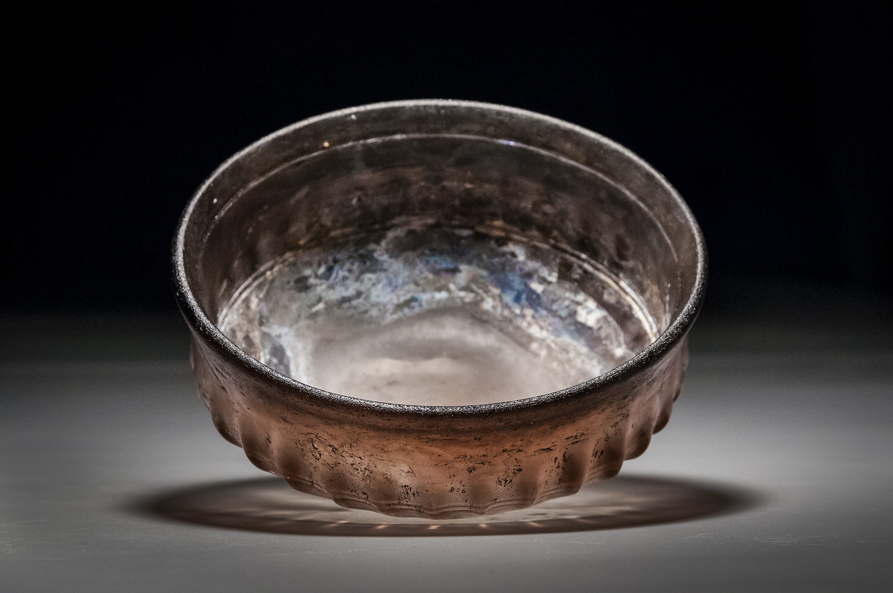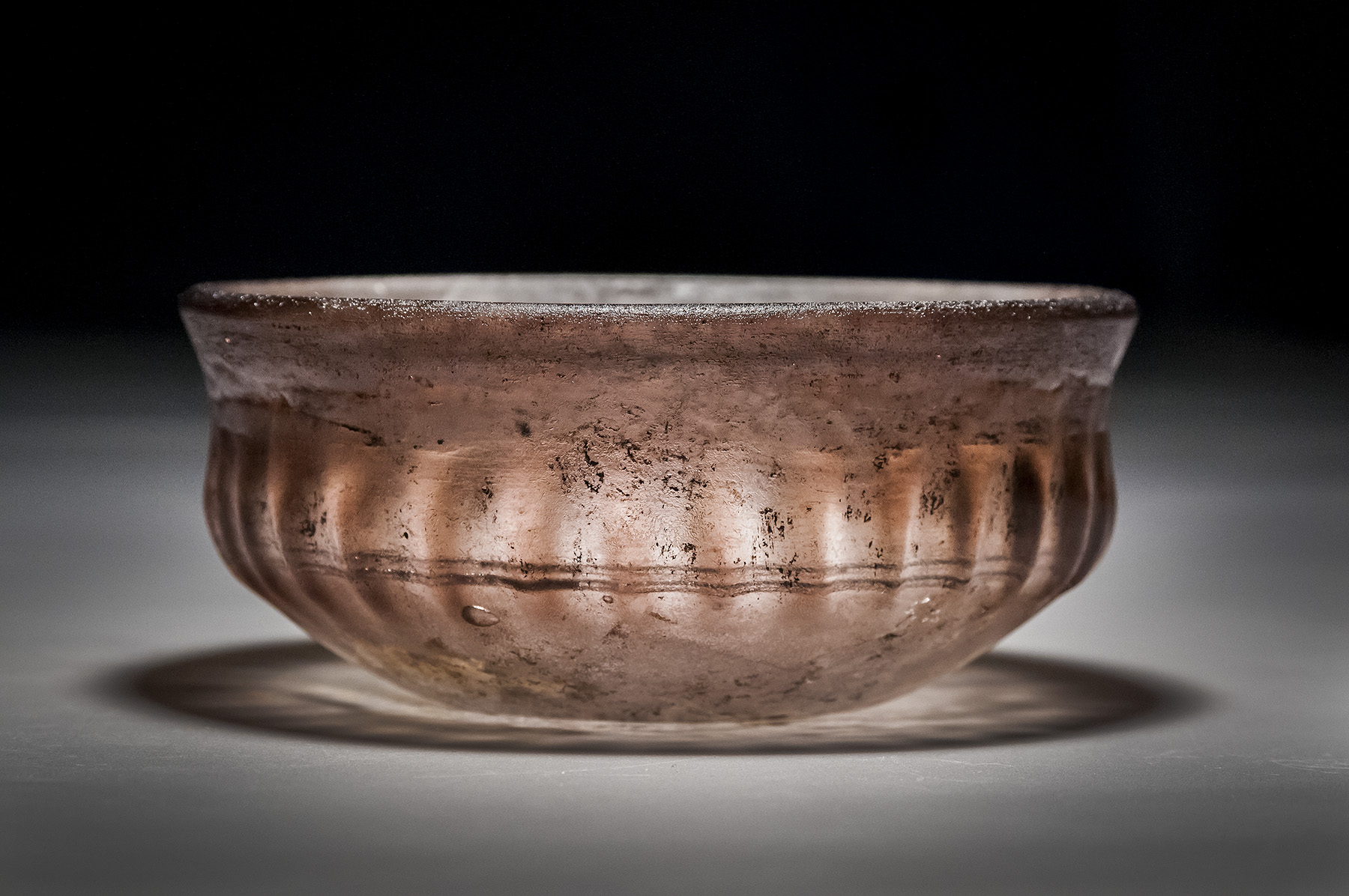A beautiful aubergine ribbed glass bowl with a flared rim and two incised lines around the body.