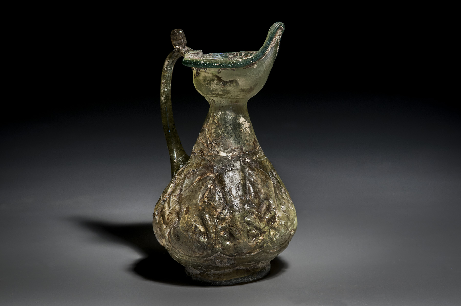 An elegant Islamic glass bottle with a pointy rim, a single handle, and decorated with a leaf motif around the body
