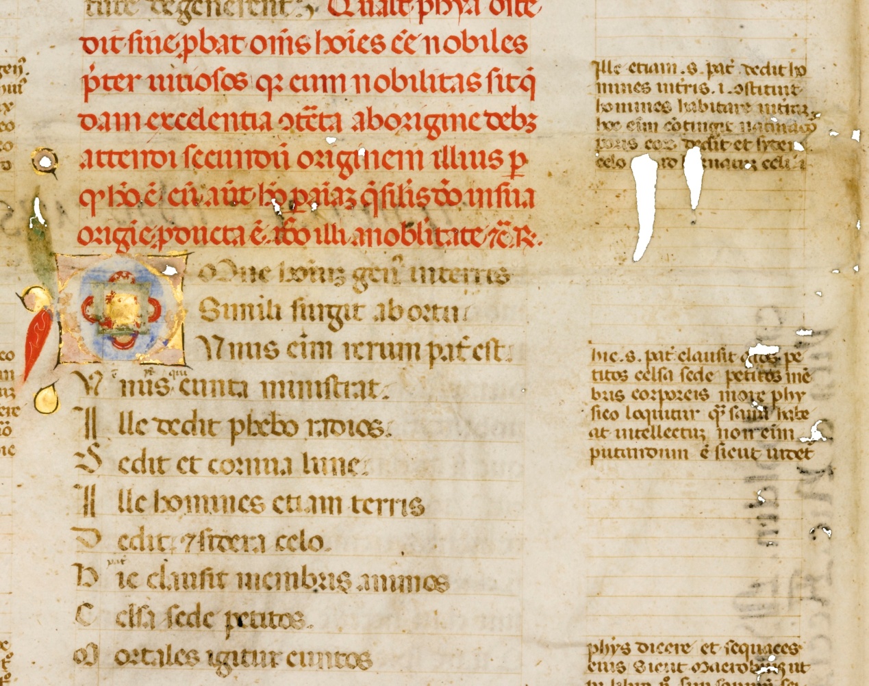 An Illuminated Manuscript On Vellum [Italy (Perhaps Florence), Fourteenth Century] a leaf, 315mm. by 230mm., 22 lines in a high grade angular bookhand, initials formed from ornamental penstrokes and separated from beginning of lines of verse, full border of the continuous gloss of the early fourteenth-century English author William Wheatley (see below) in smaller hand, rubrics and paragraph marks in red, two illuminated initials on blue or pink grounds with scrolling coloured acanthus leaves and large teardrop-like bezants, recovered from the binding of a series of Florentine historical works, partly by the Florentine humanist Matteo Palmieri, with sixteenth-century inscriptions identifying those works on its blank back, with scuffs, rubbing to initials, folds and small holes in places (with minor affect to 3 of glosses), overall in fair and presentable condition.