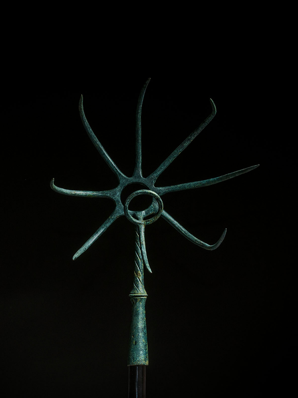 A bronze Etruscan harpago, or underwater sponge collecting hook, with seven curved tines set radially around a central torus. The hook piece is set upon a large handle with a coiled design along its shaft. An additional pair of tines protrudes just below the torus at the top of the coiled shaft.