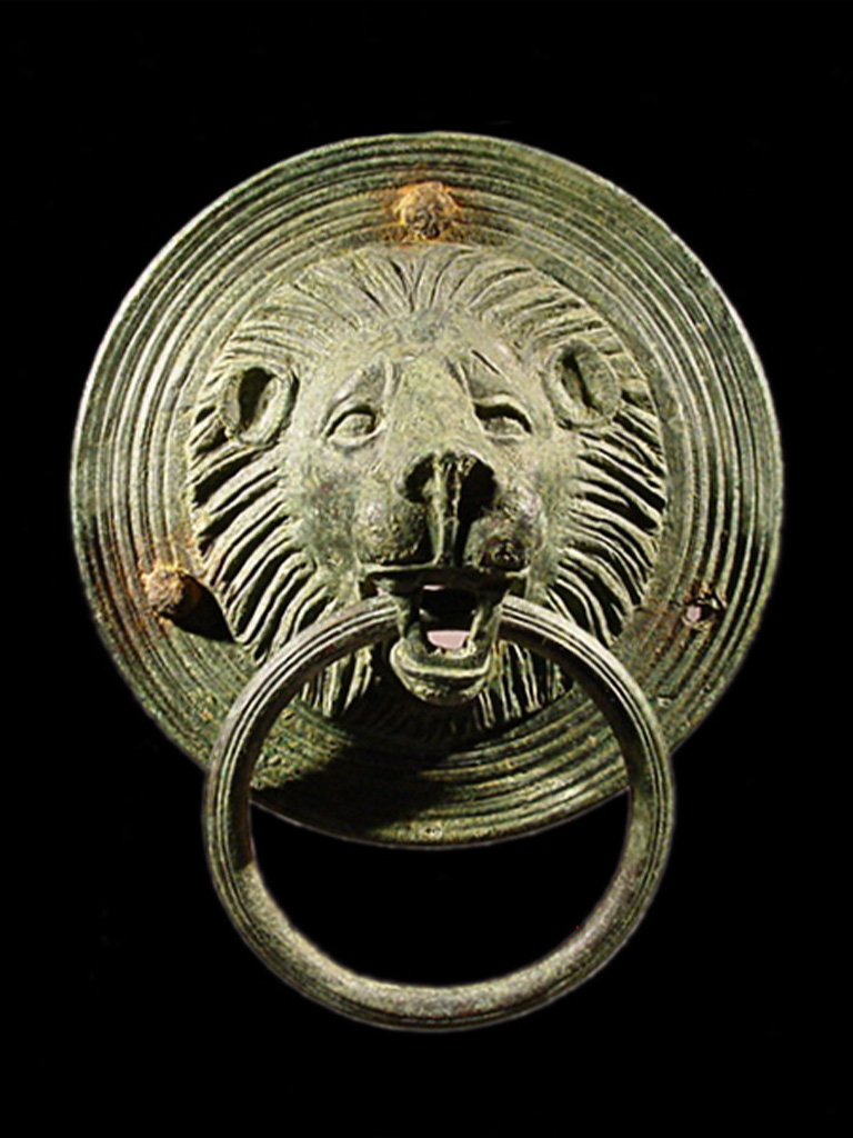 Here we see a bronze handle with a lion’s head holding the bronze ring from its mouth. This handle was cast sometime between 100 C.E. – 300 C.E. and depicts the lion in a highly realistic manner with much care given to the proportion of its protruding snout, fierce teeth, and vibrant mane. The heads of two iron nails remain from where the handle was hammered onto the surface from which it rested against. A series of concentric circles frame the lion’s head with beautiful precision, while the handle’s ring is fully intact and symmetrical.