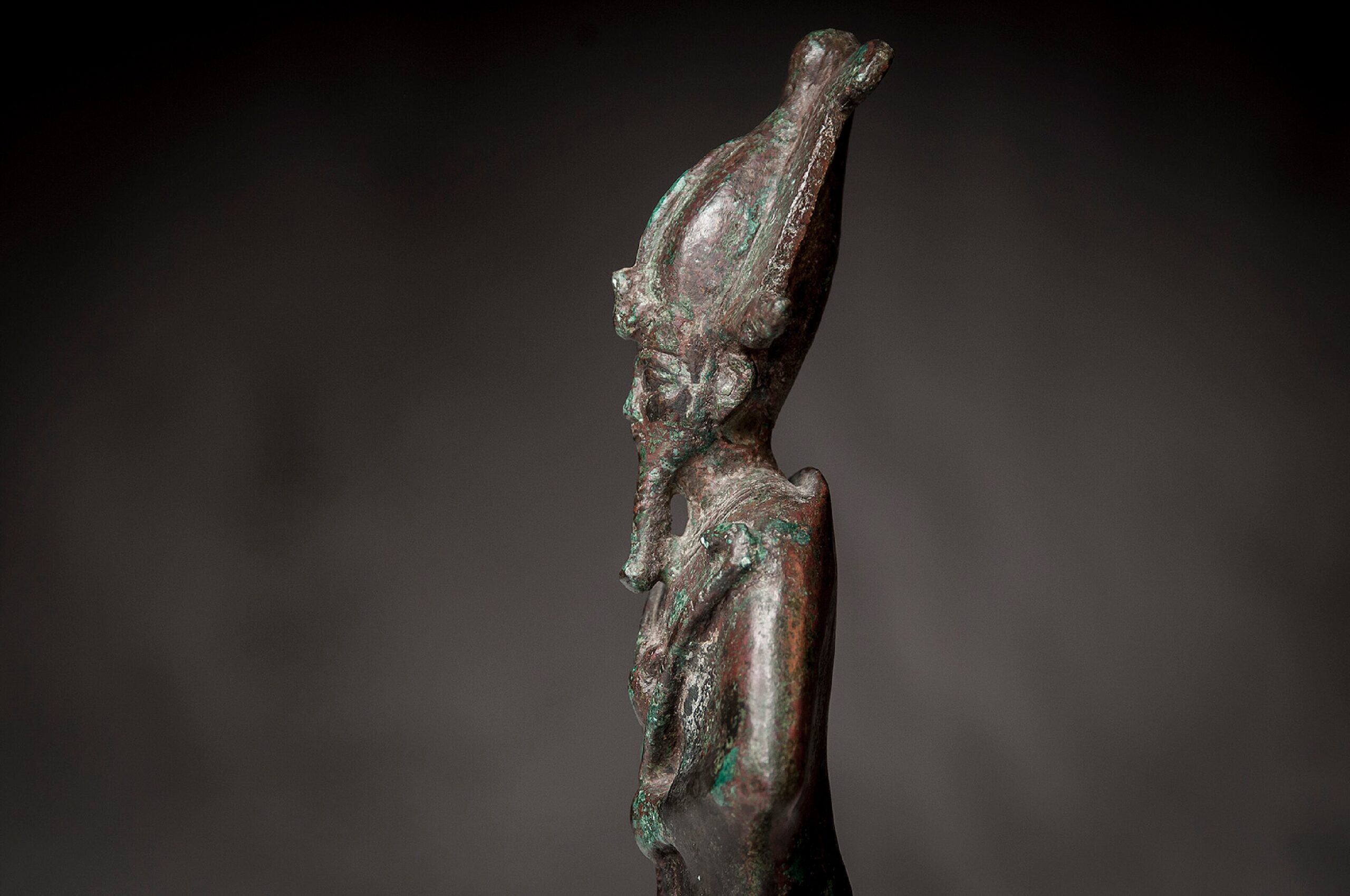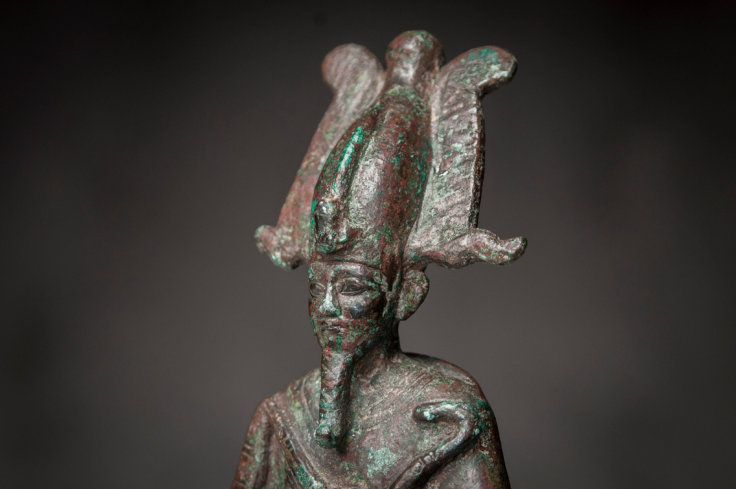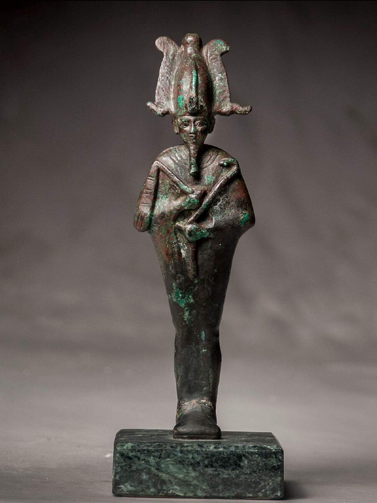Bronze statuette of Osiris in traditional pose of arms crossed, holding a croREFERENCE #