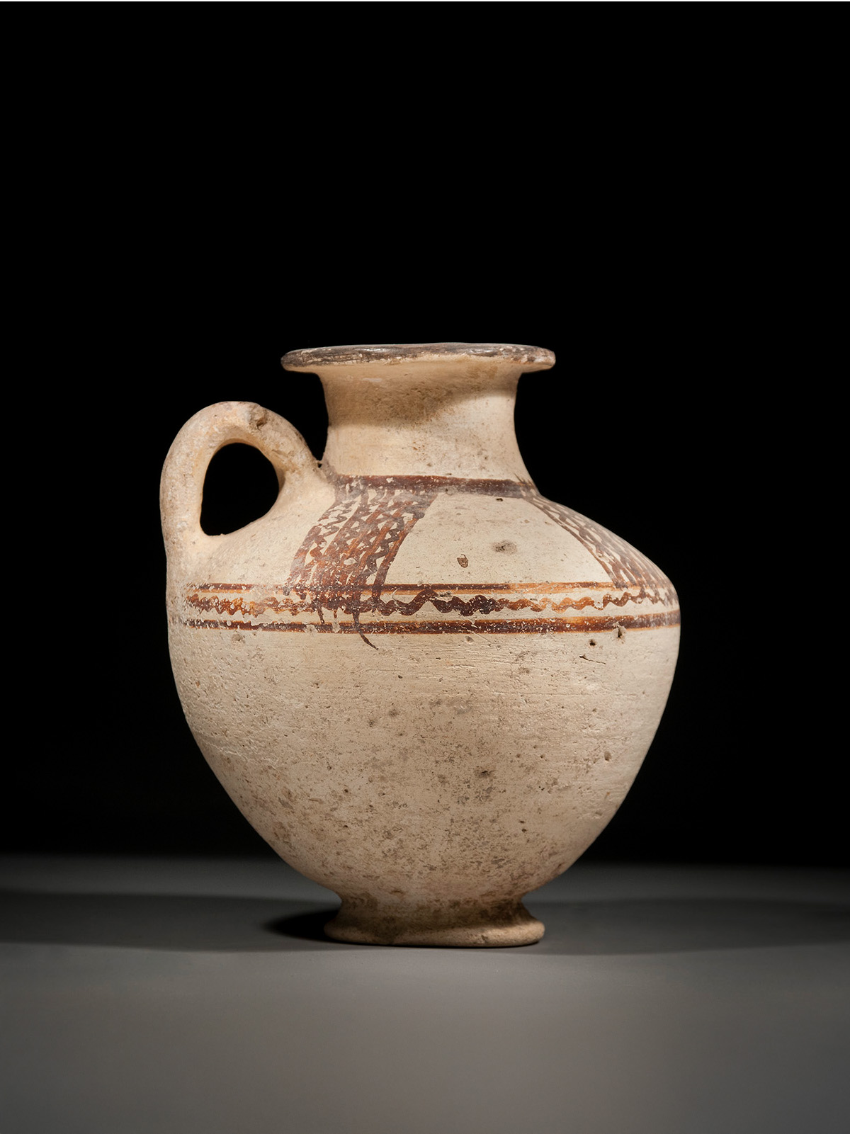 A handle rises abruptly from the body and connects at the neck’s base, making a sturdy loop for the well-worn hands of an ancient Canaanite