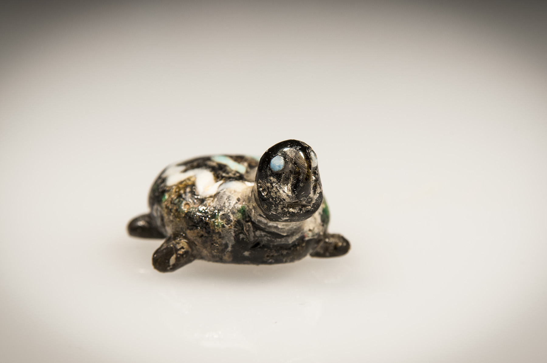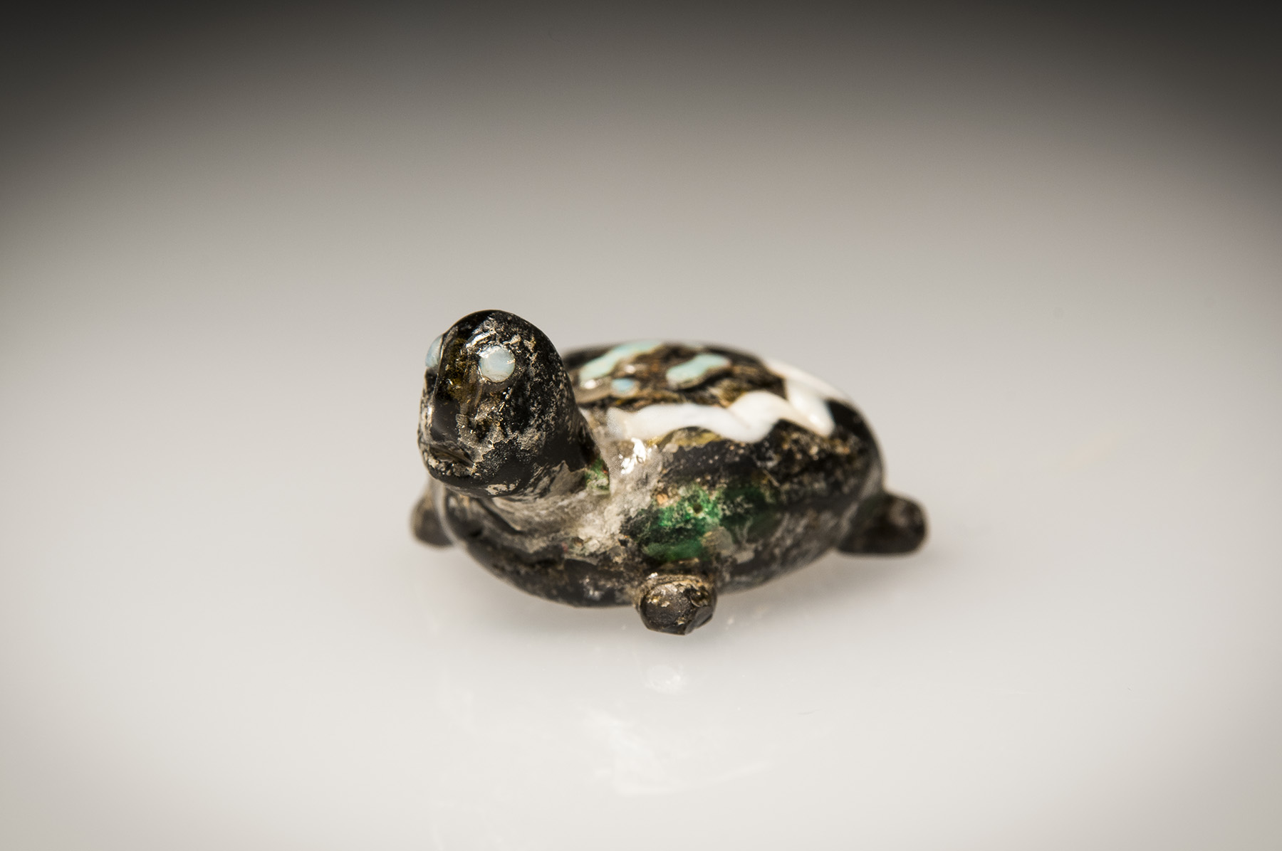 Extraordinary core formed glass tortoise of Byzantine origin. Simple nubs of the feet and tail protrude from small-shelled body, atop of which lie a stylized ring of white glass surrounding two bands and two dots, both turquoise. Figurine’s head contains two turquoise glass eyes as well as a short, ridged nose and a small mouth. Richly speckled throughout with original emerald-green patina.