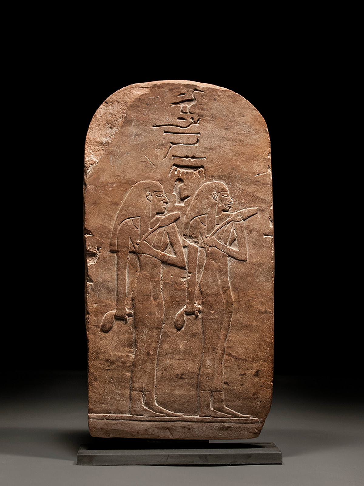 A beautiful Egyptian hieroglyphics inscription above the figures gives the name ‘Nes-Noub‘ (Noub is also known as Chnoubis among other variants).  The style of the carving allows a fairly precise dating to the reign of Amenhotep I (r. 1514 – 1493 BCE) at the very beginning of the 18th Dynasty. Features such as the well defined nostrils, giving the nose a pinched appearance are typical of this period.