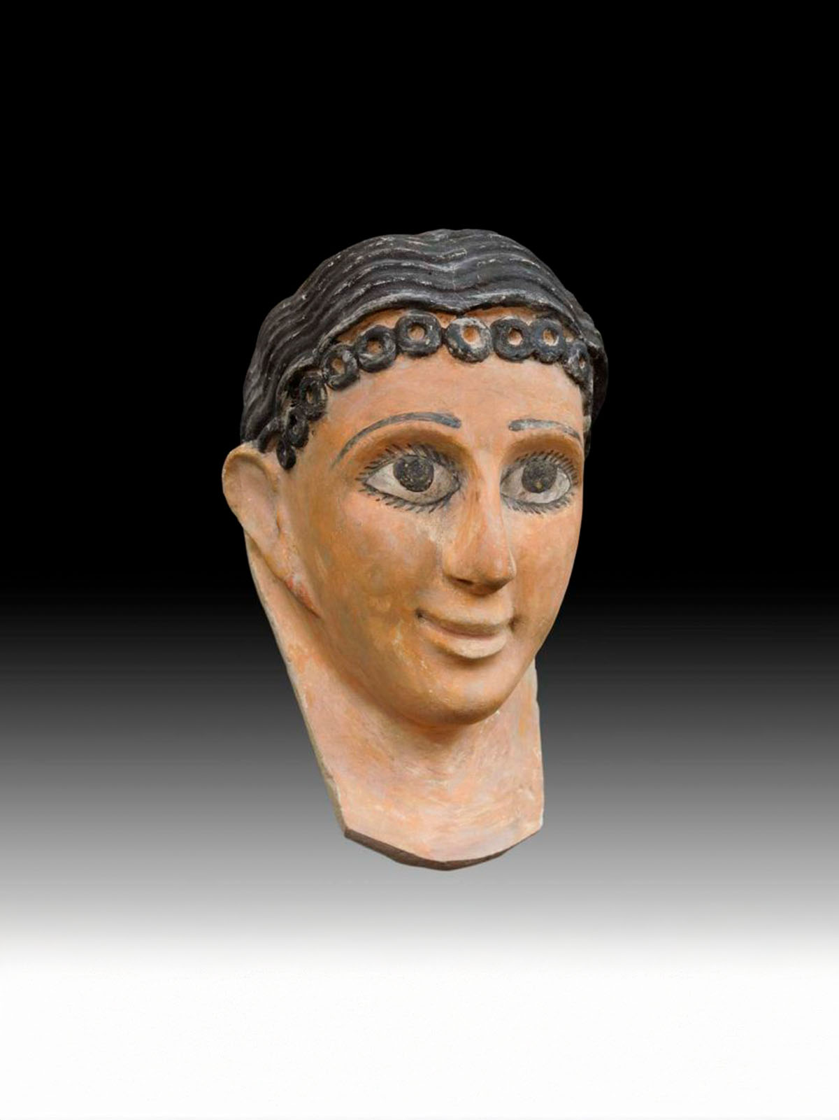 Plaster mummy portrait of a young girl, with slender features and tan flesh tones. Her full lips are pursed into a smile, rendering her features serene. Her black hair is molded with front row of small curls, and parted in the middle hair fashion. The eyes and eyebrows are stylistically delineated with black lines and beautiful lashes. She is wearing a pair of earrings. Areas of linen wrappings are preserved on the interior.