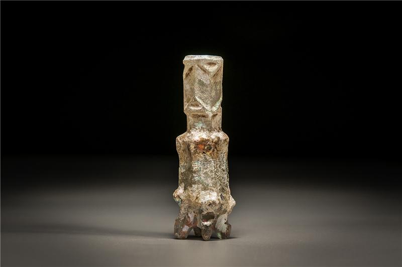 Colorless, bubbly/mold-blown. Ground rim, neck narrowing toward bottom, square body, which at the bottom part divides into four cut wedge-shaped feet arranged around a flat bottom. The Molar bottle is a characteristic example of cut Islamic glass. Its name derives from the four wedge-shaped feet, which resemble the root of a molar tooth. In Lamm’s opinion, such bottles were manufactured in Egypt, from where they were distributed throughout the Islamic world as perfume containers. Similar bottles were also fashioned from metal and ivory. They were common in the 900 and 1000 AD, but thereafter their production was ceased. They have been found in Iraq, Iran, Egypt, Syria and the holy land.