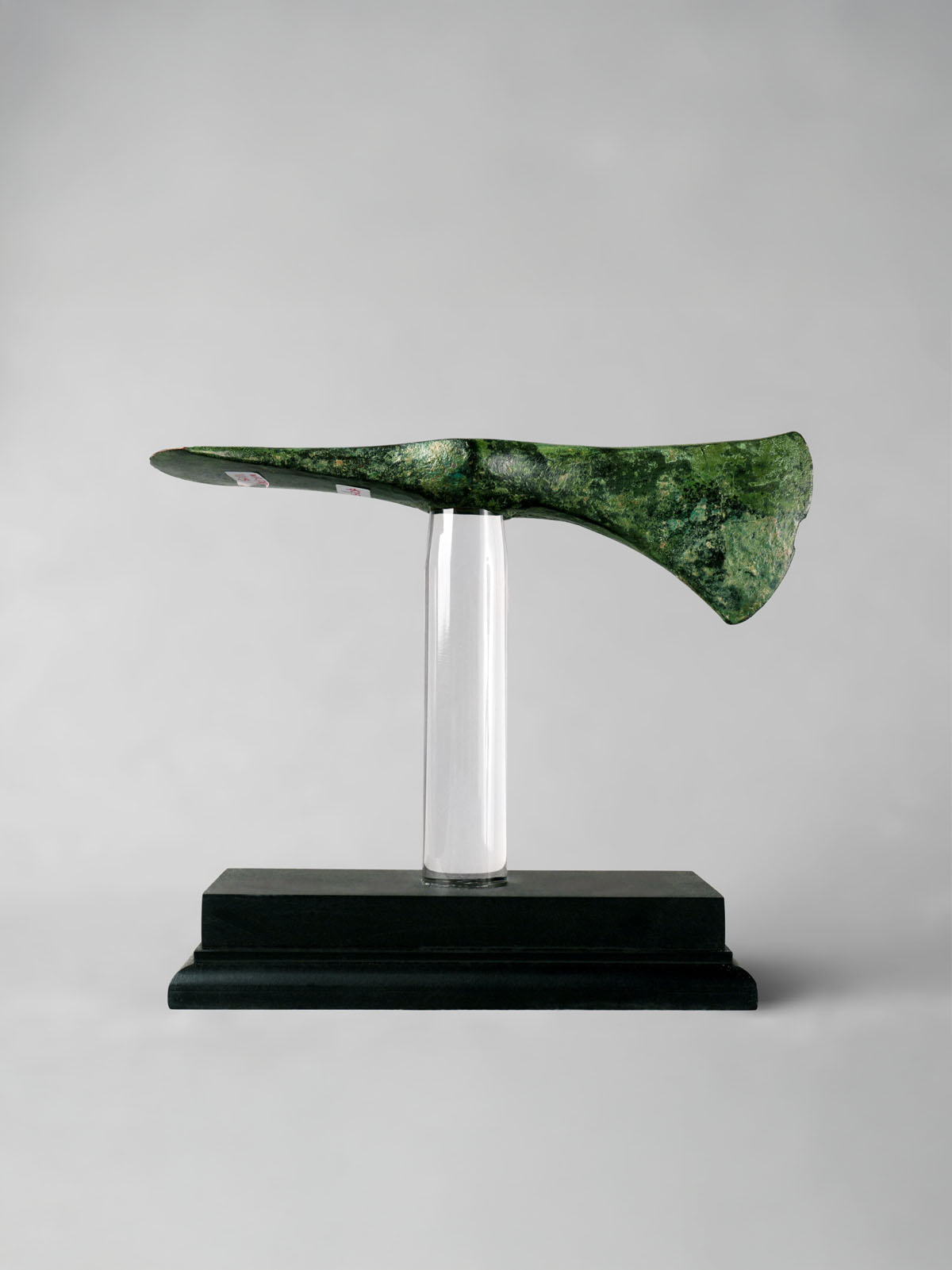 A cast bronze axe head with a cylindrical socketing shaft, a tapered spike on the back end, and a horizontal axe blade on the front.