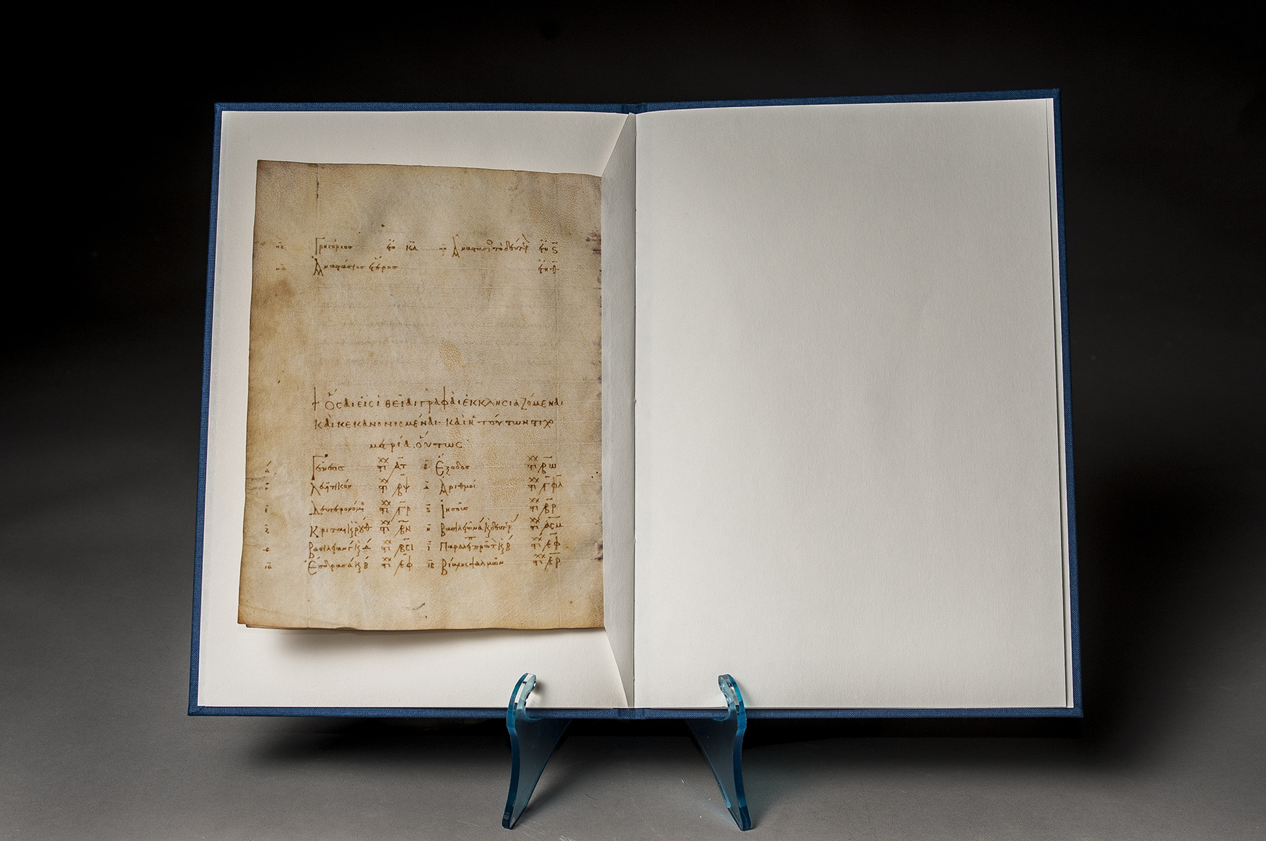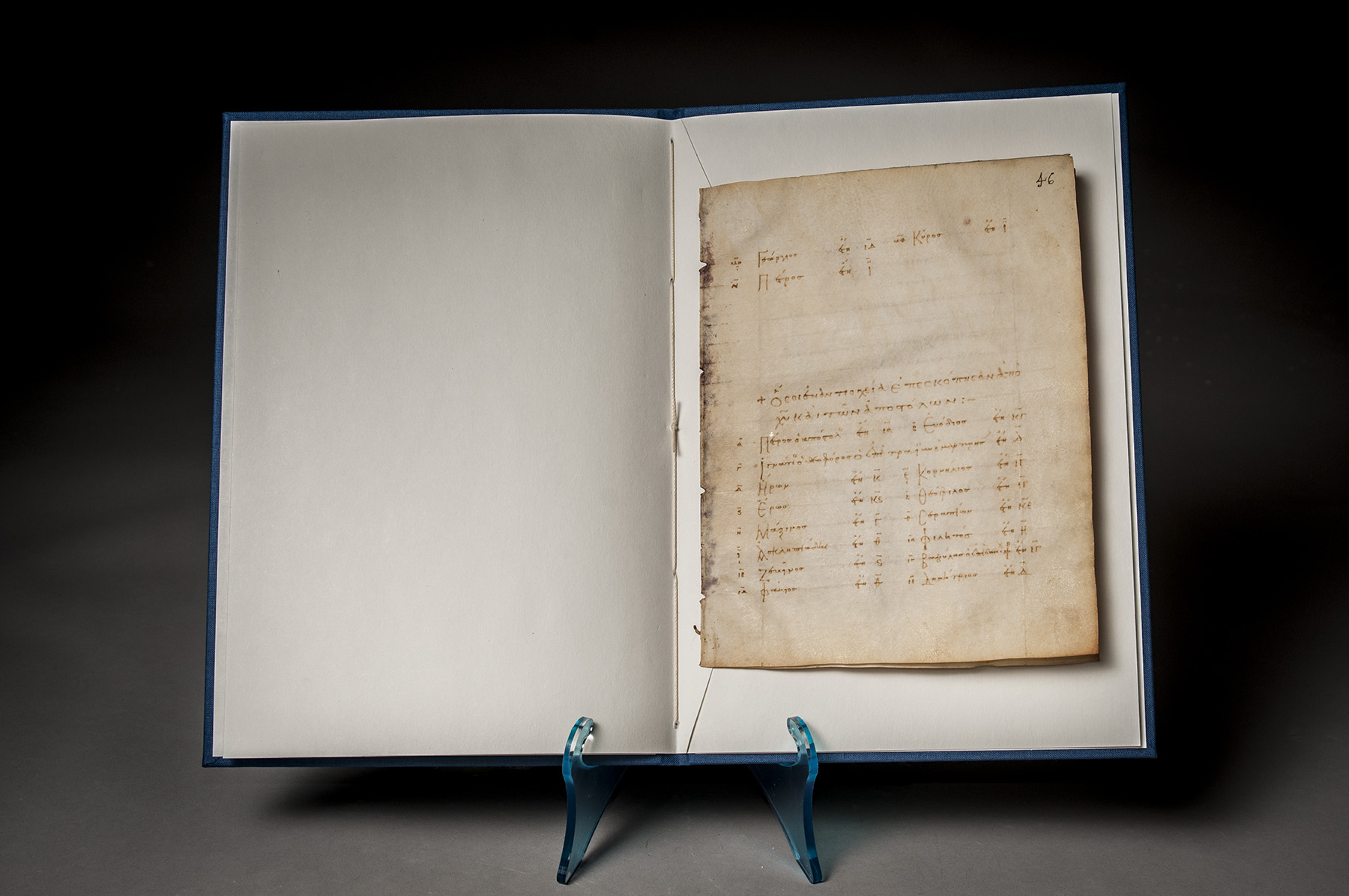 Provenance: (a) the conservative character of the writing is very marked, as is customary with the codices vetustissimi and vetusti of the 9th – 13th centuries. The minuscule slants slightly to the right, the breathings are square and the accents precise, and there is no enlargement of certain letters and intermixing with uncial forms as tends to happen in later centuries, all indicating a possible dating to the 10th century. The list of the Patriarchs of Alexandria ends with Peter IV (642-651), while the list of the Patriarchs of Antioch ends with Anastasius II (599-610), and the scribe has left space for 9 and 10 more names respectively, which would suggest he was copying the text from an earlier manuscript and writing a few centuries after the names listed. (b) ANDRe ROORYCK (1923-2010), sold at Sotheby’s, 5 July 2005, lot 7. An interesting and early bifolium from what would probably have been a compendium of useful religious dates, events, and lists relating to the Greek Orthodox Church. George I (621-630), Cyrus (631-641) and Peter IV (642-651) close the list of Patriarchs of Alexandria (following the Greek Orthodox as opposed to the Coptic Orthodox tradition, after the schism of 536), while the Patriarchs of Antioch run from Peter the Apostle (c.37 – 53) to Anastasius II (599-610).