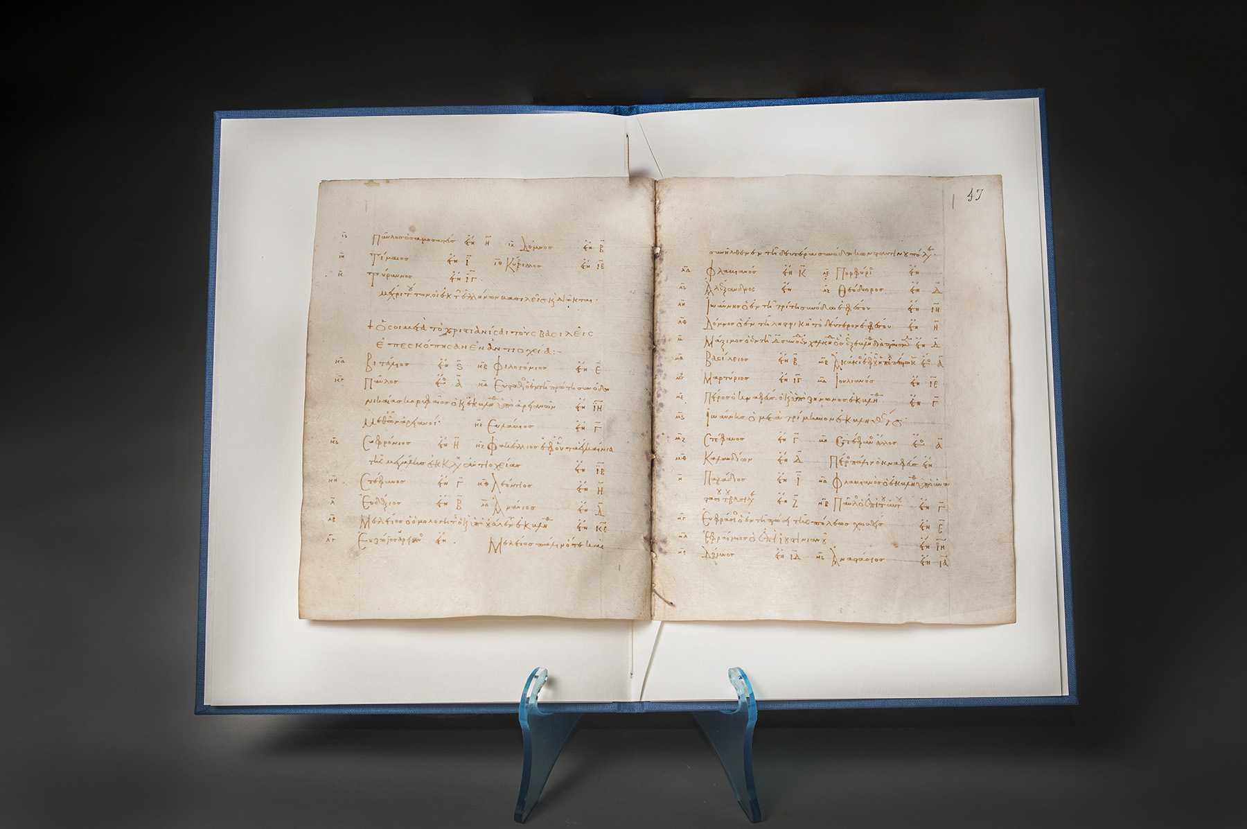 ANTIOCH preceded by the end of a list of the PATRIARCHS OF ALEXANDRIA and followed by a list of the canonical books of the Bible, in Greek, bifolium from a MANUSCRIPT ON VELLUM [Greece?, mid- to late- 10th century] 196 x 153mm. 17 lines ruled in blind written in brown ink in a fine and formal Greek minuscule, headings in uncials, modern foliation 46-47. In a modern cloth binding.
