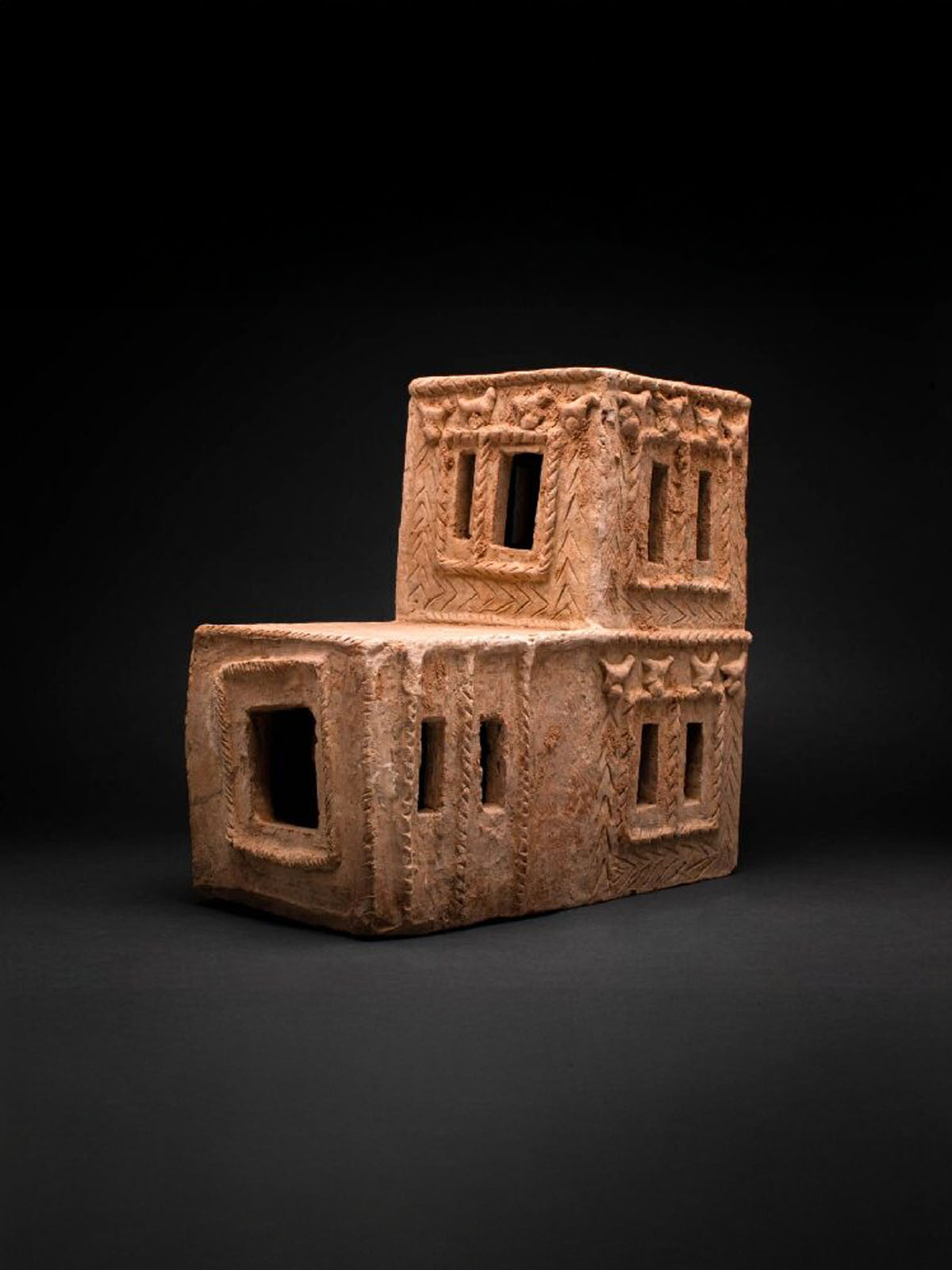 An incredible Mesopotamian architectural terracotta model designed as an ancient Mesopotamian house with two stories. Little and narrow windows were used to preserve the internal rooms from the hot rays of the sun. The second floor with the same characteristics.