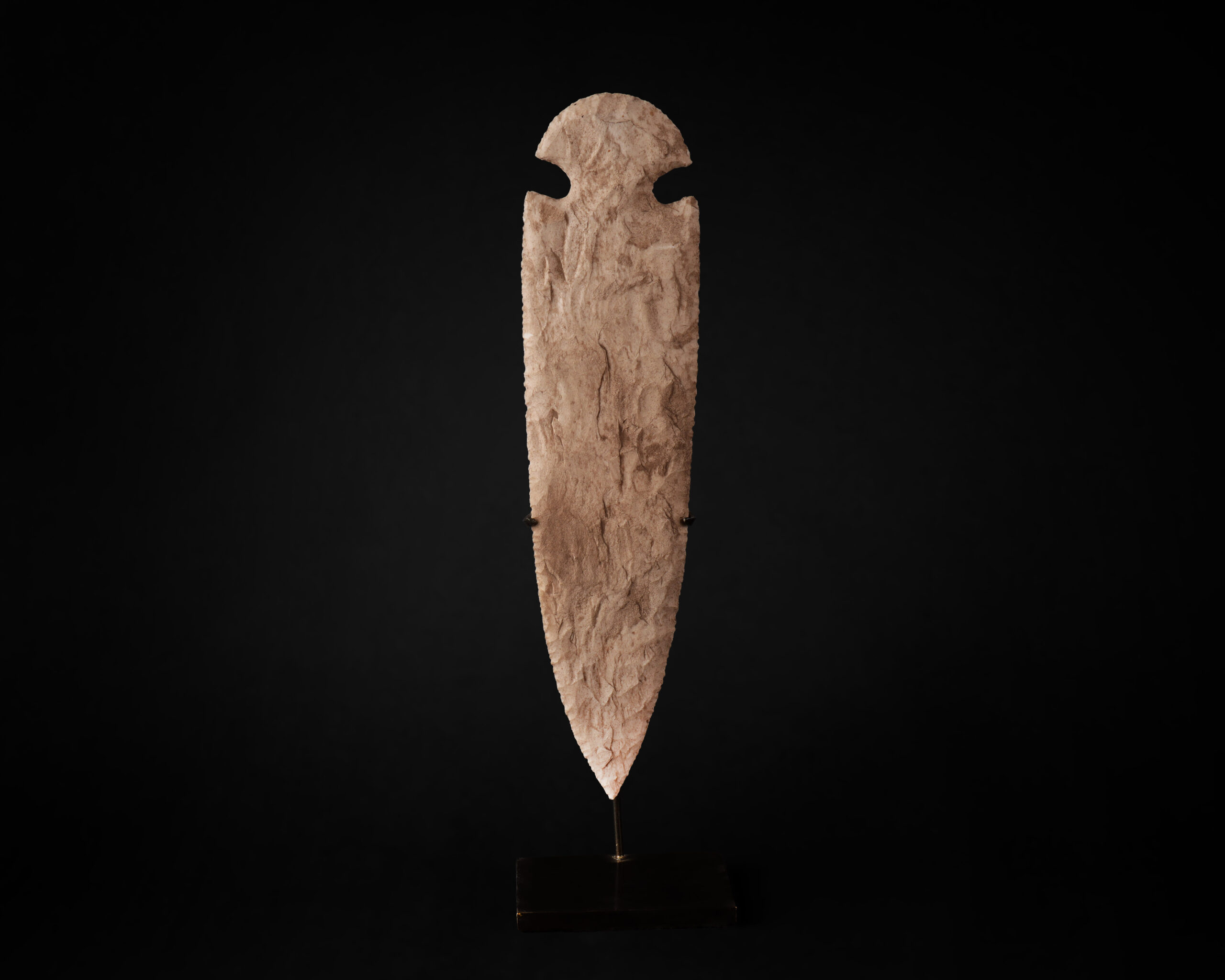 This exceptional Neolithic flint dagger exemplifies the sophisticated stone tool craftsmanship of early Egypt or the broader Levantine region, dating from approximately 6000 to 3150 BCE. The elongated, pointed form showcases skillful knapping and pressure flaking techniques, with a smooth surface and subtle signs of use wear, indicating its original function as a utilitarian weapon or ceremonial object. Made from high-quality flint, its natural color ranges from light beige to pale brown, with a finely worked edge that demonstrates the precision and artistry of Neolithic artisans. This piece retains excellent preservation and exhibits the characteristic features of early prehistoric tools—both functional and symbolic. Its history and craftsmanship make it a noteworthy acquisition for collectors, museums, or institutions seeking authentic artifacts from one of the most significant periods in human history. An opportunity to acquire a unique and visually striking example of ancient stone technology with profound cultural and archaeological significance.