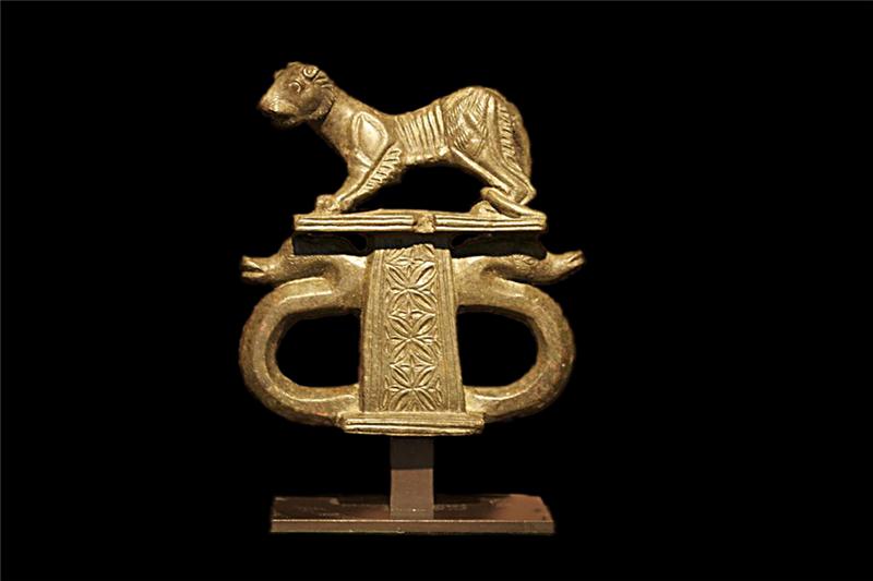 Parthian bronze chariot fixture where the two ropes from each horse go into the two holes formed from the loops of the two geese