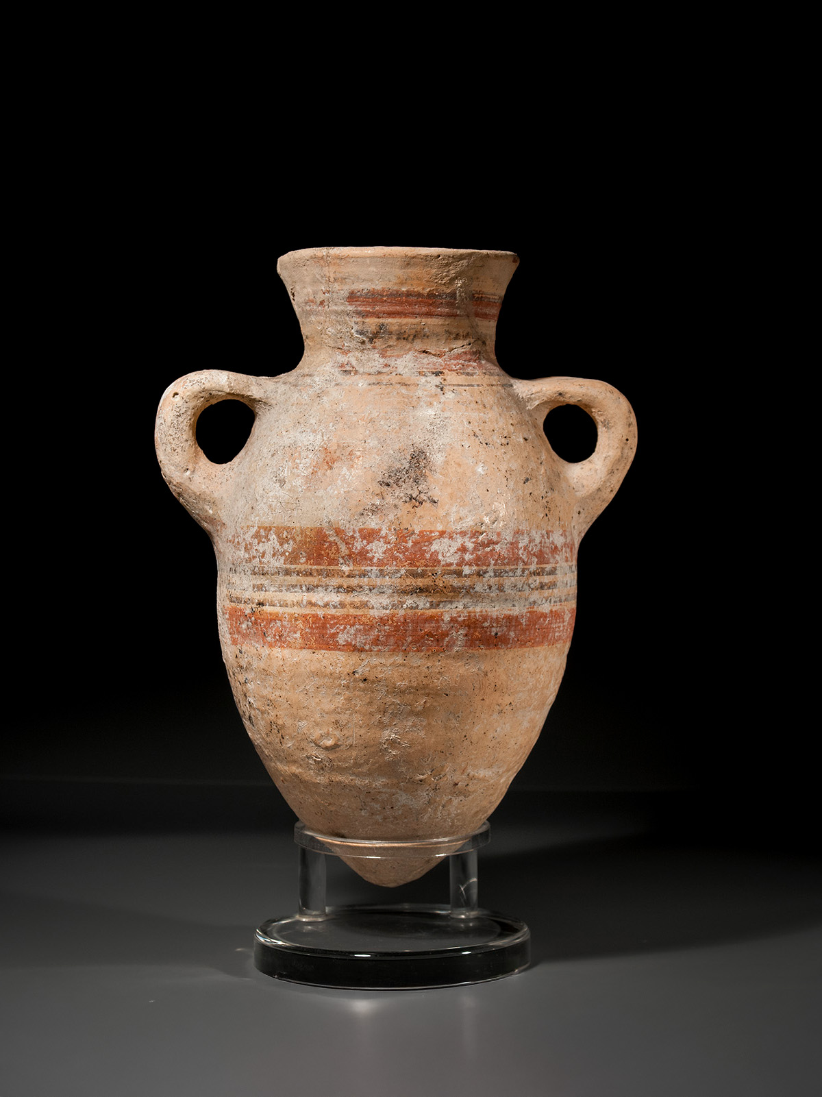 The smooth sides of this terracotta amphora remain in excellent condition, while the bichrome bands are still crisp and distinctly colored.