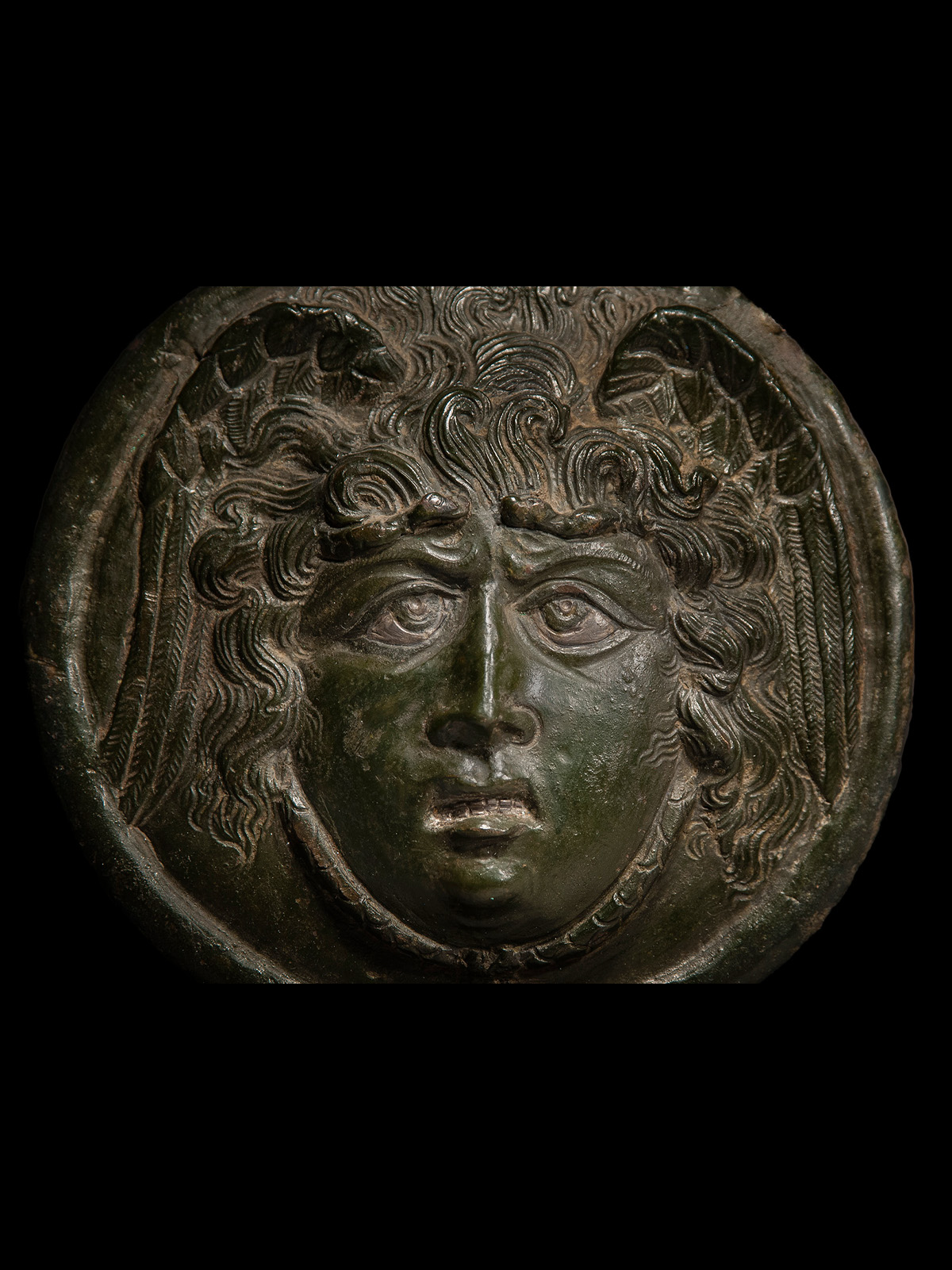 Medusa, the beautiful gorgon with winged head and snaky hair, is modeled in relief on the convex disc, as a beautiful woman with severe face, her long hair falling in rich curls around her head, turned into curled snakes, tied below her chin. A large pair of wings coming out from the top of her head and spreading to its sides.