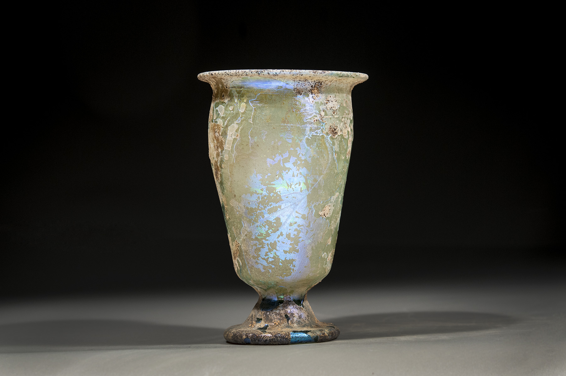 A Roman glass beaker with a flaring mouth and a ring footed base