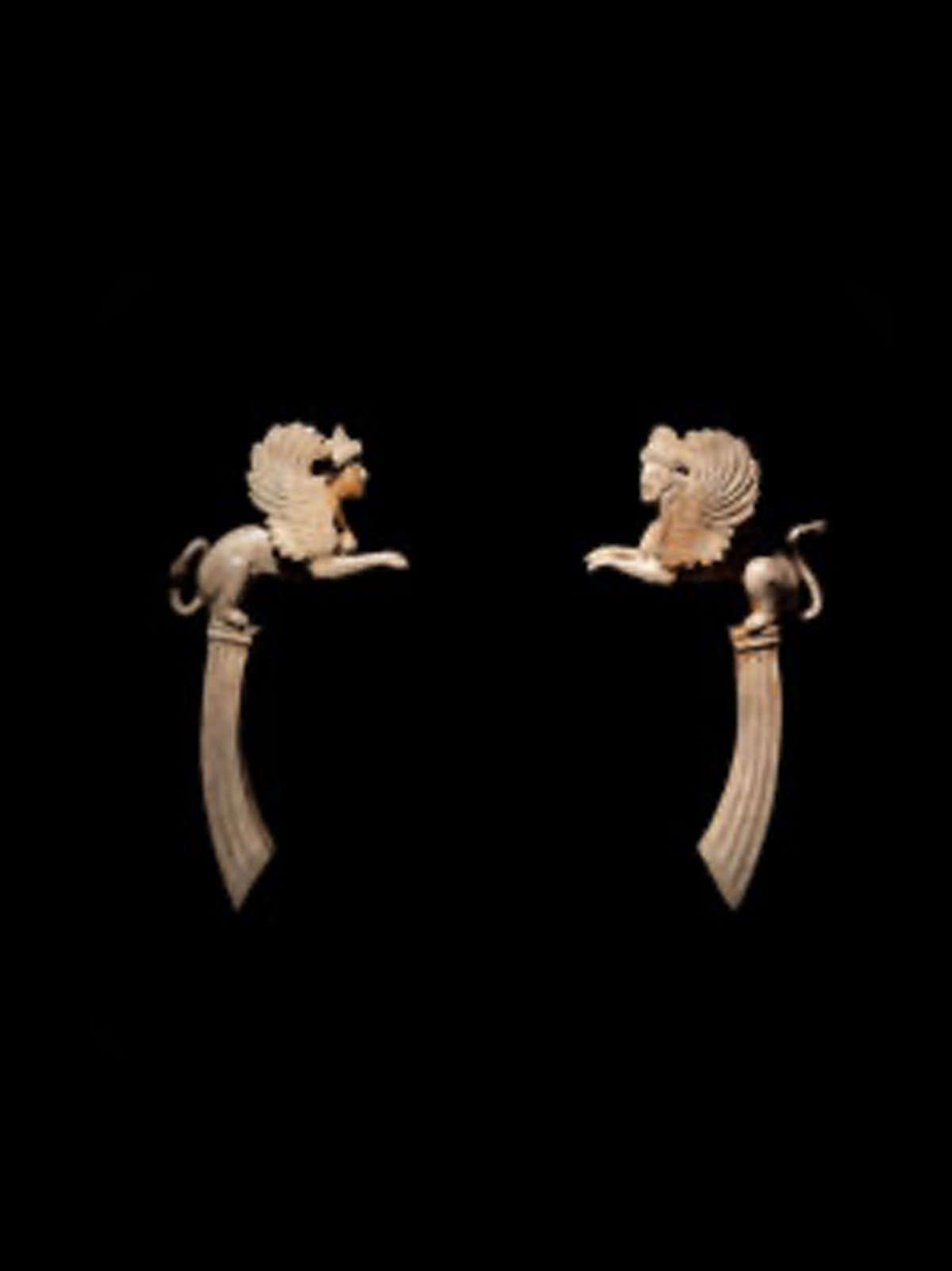 Two handles from a bowl, pot or goblet. The square section is hollow and convex in shape to make holding the vessel easier. Each handle terminates in a sphinx standing on its back legs, with its front paws outstretched. These would be the point where the handles were attached to the upper area of the vessel.