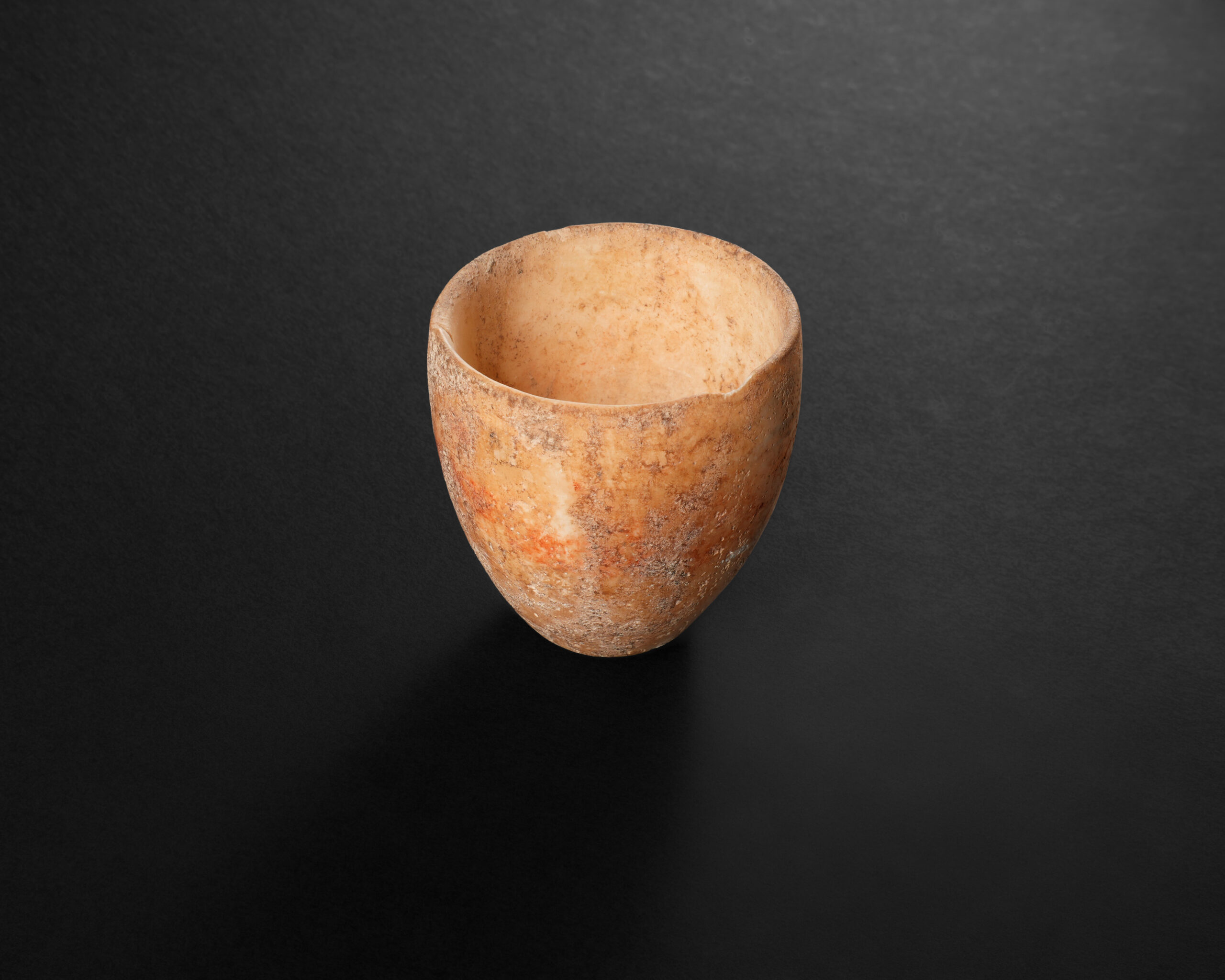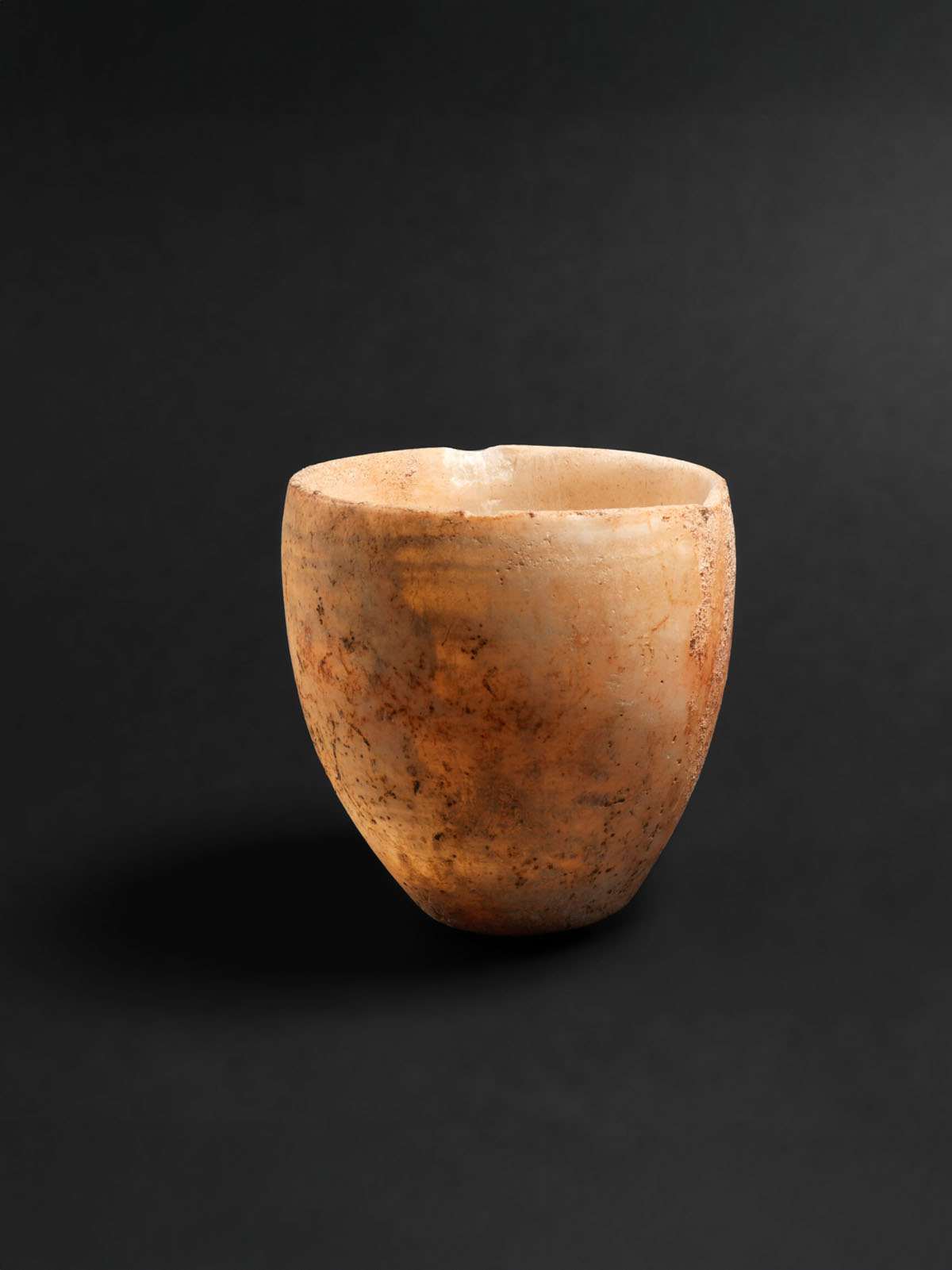 The use of alabaster, a soft stone prized for its translucence and smooth finish, suggests the object was valued and possibly used in ceremonial contexts. Both the interior and exterior surfaces have been polished to a glossy, refined texture, with no visible signs of damage or deterioration. Its translucent quality would have enhanced its visual appeal when held in light, creating a delicate play of shadow and glow.