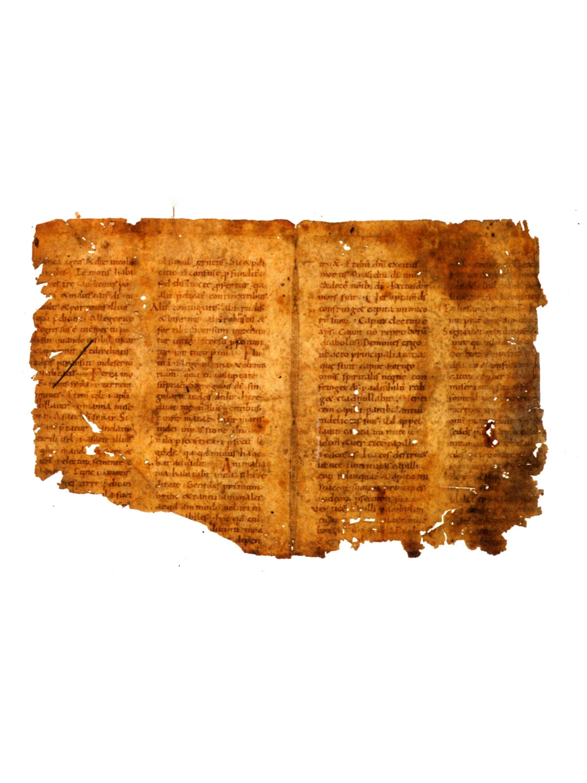 CAROLINGIAN COMMENTARY ON THE PSALMS, in Latin, two bifolia from a MANUSCRIPT ON VELLUM [Italy, 9th century] 280 x 380mm. 4 leaves (2 bifolia), ruled in blind, preserving most of two columns per page, each with 27 lines written in Carolingian minuscule in brown ink, numerous initials in two sizes in red (recovered from a binding, and thus very worn on one side of each bifolium, and with significant losses on three sides). In an archival folder. Provenance: Sotheby’s, 19 June 1990, lot 1. Legible passages of text consist of short phrases of Psalm 67: verses 6, 9-14, 16-17, 19, 22, and 25, presented as short lemmata interspersed by passages of commentary. The eight pages appear to be textually consecutive and would therefore originally have been the central two bifolia of their gathering. THE COMMENTARY IS THUS FAR UNIDENTIFIED, AND PERHAPS NOT PREVIOUSLY RECORDED. In the 9th century there were three main commentaries on the Psalms: Augustine’s Ennarationes in Psalmos, Cassiodorus’s Expositio Psalmorum, and Pseudo-Jerome’s Breviarium; the present fragment is none of these. Other much rarer ones were the Glossa ex traditionum seniorum, Bede’s Titulatio, and the commentary found in the Mondsee Psalter. See M. Gibson, ‘Carolingian Glossed Psalters’, in R. Gameson, ed., The Early Medieval Bible: Its Production, Decoration and Use, Cambridge, 1994, esp. pp.96